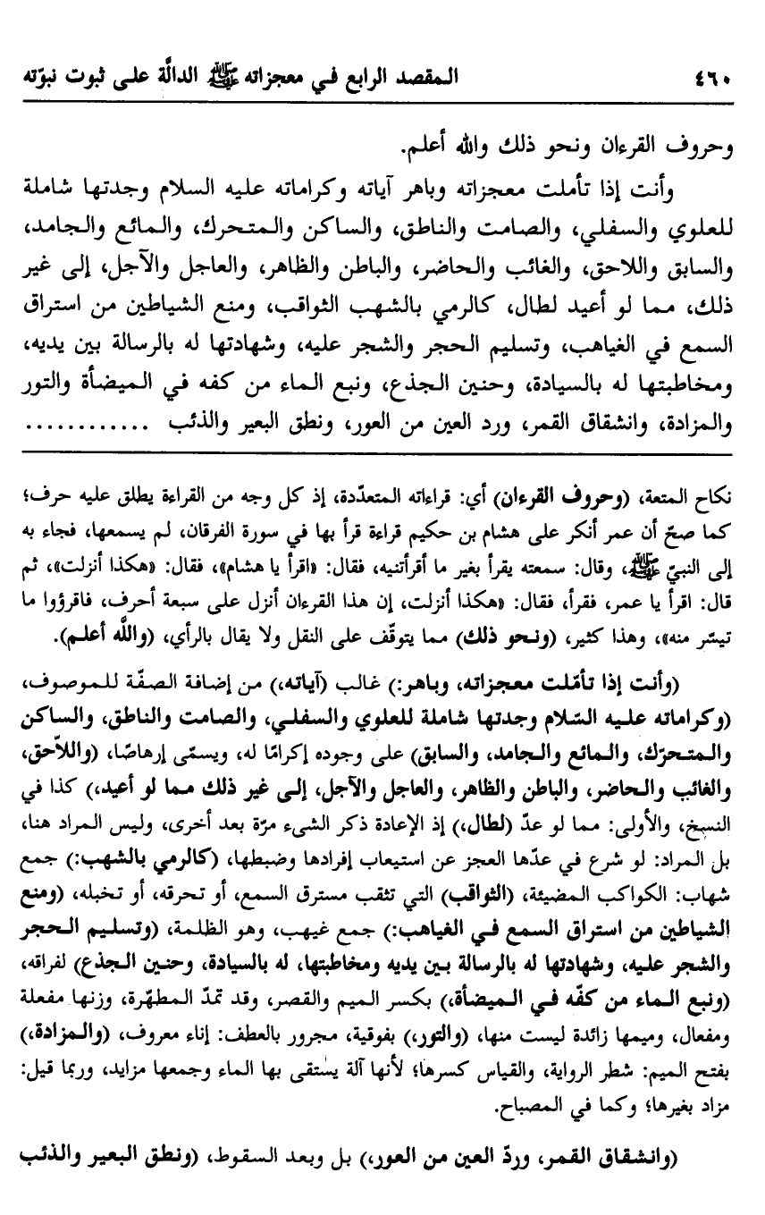 وأنت إذا تأمَّلت معجزاته وباهر آياته وكراماته -عليه السلام, وجدتها شاملة للعلوي والسفلي، والصامت والناطق، والساكن والمتحرك، والمائع والجامد، والسابق واللاحق، والغائب والحاضر، والباطن والظاهر، والعاجل والآجل, إلى غير ذلك مما لو أعيد لطال، كالرمي بالشهب الثواقب، ومنع الشياطين من استراق السمع في الغياهب، وتسليم الحجر والشجر عليه، وشهادتها له بالرسالة بين يديه, ومخاطبتها له بالسيادة، وحنين الجذع، ونبع الماء من كفِّه في الميضأة والتور والمزادة, وانشقاق القمر، ورد العين من العور، ونطق البعير والذئب..........................................