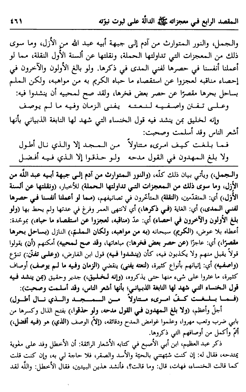 والجمل", ويأتي بيان ذلك كله، "والنور المتوارث من آدم إلى جبهة أبيه عبد الله من الأزل، وما سوى ذلك من المعجزات التي تداولتها الحملة" للأخبار، "ونقلتها عن ألسنة الأُوَل" أي: المقدمين "النقلة" المتأخرون في تصانيفهم، "مما لو أعملنا أنفسنا في حصرها لفني المدى،" أي: الغاية "في ذكرها" أي: لانتهى العمر وفرغ في عدتها ولم يحط بها "ولو بلغ الأولون والآخرون في إحصاء" أي: عدّ "مناقبه، لعجزوا عن استقصاء ما حباه" بموحدة: أعطاه بلا عوض، "الكريم" سبحانه "به من مواهبه، ولكان الملمّ" النازل "بساحل بحرها مقصرًا" أي: عاجزًا "عن حصر بعض فخرها" مباهاتها، وقد صحَّ لمحبيه" أمكنهم "أن" يقولوا قولًا يقبل منهم ولا يكذبون فيه، كأن ينشدوا فيه" قول ابن الفارض، "وعلى تفنن" تنوع "واصفيه" أي: إتيانهم بأنواع كثيرة "لنعته يفنى" ينقضي "الزمان, وفيه ما لم يوصف" أوصاف كثيرة، ما عثروا على شيء منها حتى يذكروه, "وإنه لخليق" جدير وحقيق "بمن ينشد فيه قول الخنساء التي شهد لها النابغة الذبياني، بأنها أشعر الناس، وقد أسلمت وصحبت":