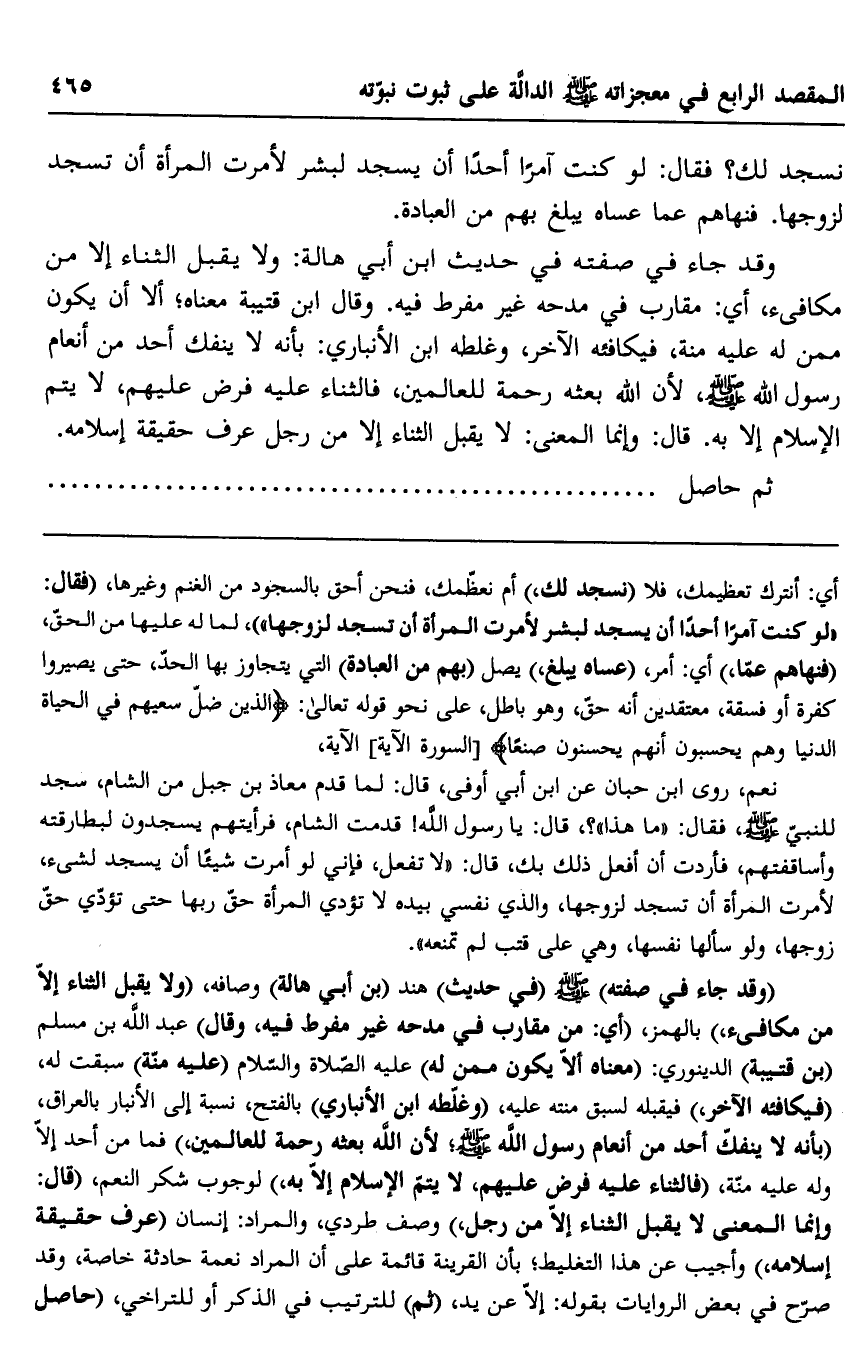 وقد جاء في صفته في حديث ابن أبي هالة: ولا يقبل الثناء إلّا من مكافيء، أي: مقارب في مدحه غير مفرِّط فيه، وقال ابن قتيبة: معناه: إلّا أن يكون ممن له عليه مِنَّة، فيكافئه الآخر، وغلَّطه ابن الأنباري، بأنه لا ينفك أحد من إنعام رسول الله -صلى الله عليه وسلم؛ لأن الله بعثه رحمة للعالمين، فالثناء عليه فرض عليهم، لا يتمّ الإسلام إلا به. قال: وإنما المعنى: لا يقبل الثناء إلّا من رجل عرف حقيقة إسلامه. ثم حاصل.............................