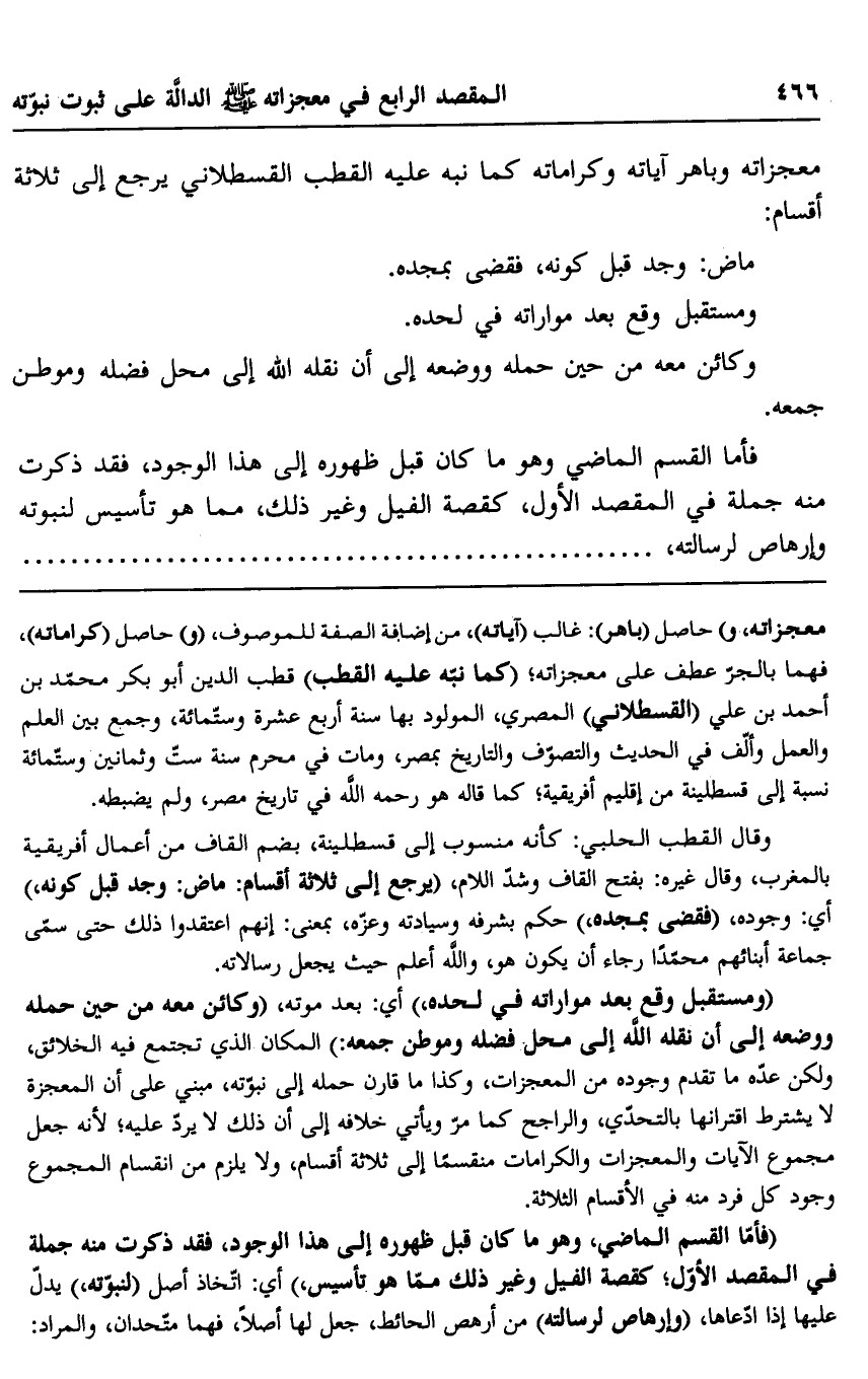 معجزاته وباهر آياته وكراماته كما نَبَّه عليه القطب القسطلاني يرجع إلى ثلاثة أقسام: