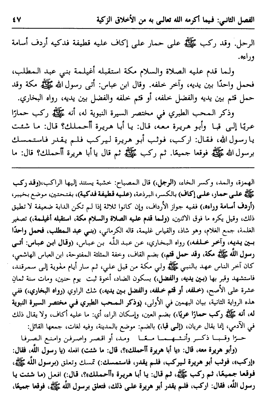 الهمزة، والمد، وكسر الخاء، "الرجل", قال المصباح: خشبة يستند إليها الراكب "وقد ركب -صلى الله عليه وسلم- على حمر، على إكاف" بالكسر، البرذعة, "عليه قطيفة فَدَكية" بفتحتين، موضع بخيبر، "أردف أسامة وراءه" ففيه جواز الإرداف، وإن كانوا ثلاثة إذا لم تكن الدابة ضعيفة لا تطبيق ذلك، وقيل: يكره ما فوق الاثنين، "ولما قدم -عليه الصلاة والسلام- مكة، استقبله أغيلمة" تصغير الغلمة، جمع الغلام، وهو شاذ، والقياس غليمة، قال الكرماني، "بني عبد المطلب، فحمل واحدًا بين يديه، وآخر خلفه" رواه البخاري، عن عبد الله بن عباس، "وقال ابن عباس: أتى رسول الله -صلى الله عليه وسلم- مكة، وقد حمل قُثَم" بضم القاف، وخفة المثلثة المفتوحة، ابن العباس الهاشمي، كان آخر الناس عهدًا بالنبي -صلى الله عليه وسلم, ولي مكة من قِبَلِ عليّ، ثم سار أيام معاوية إلى سمرقند، فاستشهد وقُبِرَ بها "بين يديه، والفضل" بسكون الضاد، أخوة ثبت يوم حنين، ومات سنة ثمان عشرة على الأصح، "خلفه، أو قثم خلفه، والفضل بين يديه" شكَّ الراوي "رواه البخاري", ففي هذه الرواية الثانية، بيان البهمين في الأولى، "وذكر المحب الطبري في مختصر السيرة النبوية له أنه -صلى الله عليه وسلم- ركب حمارًا عريًا" بضم العين، وإسكان الراء، أي: ما عليه إكاف، ولا يقال ذلك في الآدمي، إنما يقال عريان، "إلى قبا" بالضم: موضع بالمدينة، وفيه لغات، جمعها القائل: