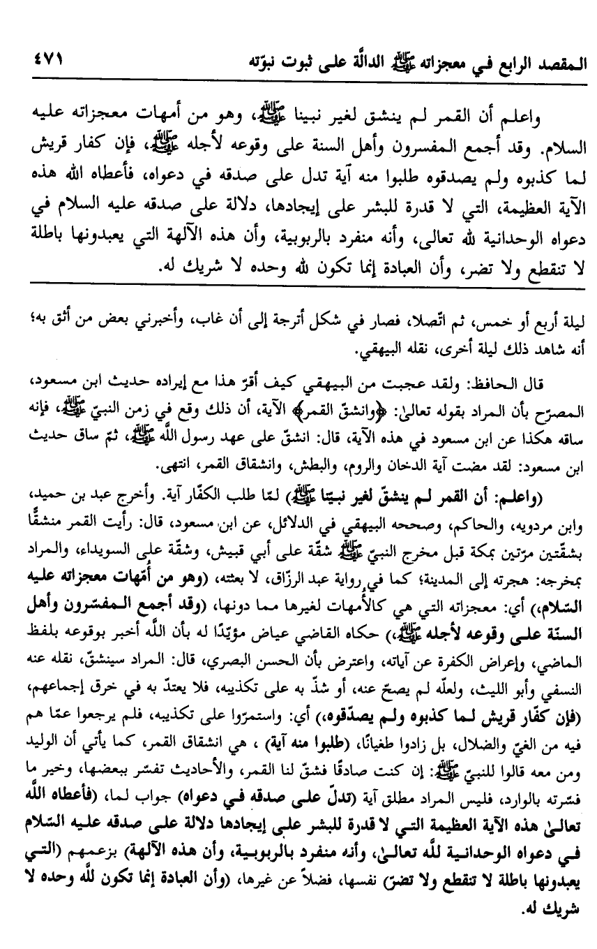 واعلم أن القمر لم ينشقّ لغير نبينا -صلى الله عليه وسلم, وهو من أمهات معجزاته -عليه السلام, وقد أجمع المفسرون وأهل السنة على وقوعه لأجله -صلى الله عليه وسلم، فإن كفَّار قريش لما كذبوه ولم يصدقوه, طلبوا منه أيةً تدل على صدقه في دعواه، فأعطاه الله هذه الآية العظيمة، التي لا قدرة للبشر على إيجادها، دلالة على صدقه -عليه السلام- في دعواه الوحدانية لله تعالى، وأنَّه منفرد بالربوبية، وأن هذه الآلهة التي يعبدونها باطلة لا تنفع ولا تضر، وأن العبادة إنما تكون لله وحده لا شريك له.