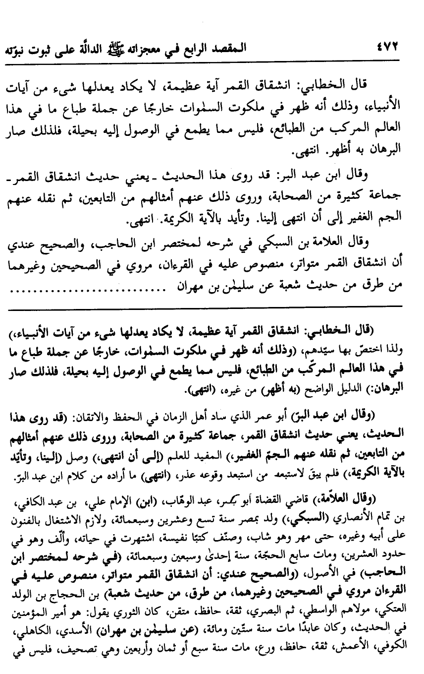 وقال العلامة بن السبكي في شرحه لمختصر ابن الحاجب: والصحيح عندي أنَّ انشقاق القمر متواتر، منصوص عليه في القرآن، مروي في الصحيحين وغيرهما من طرقٍ من حديث شعبة عن سليمان بن مهران...........................................