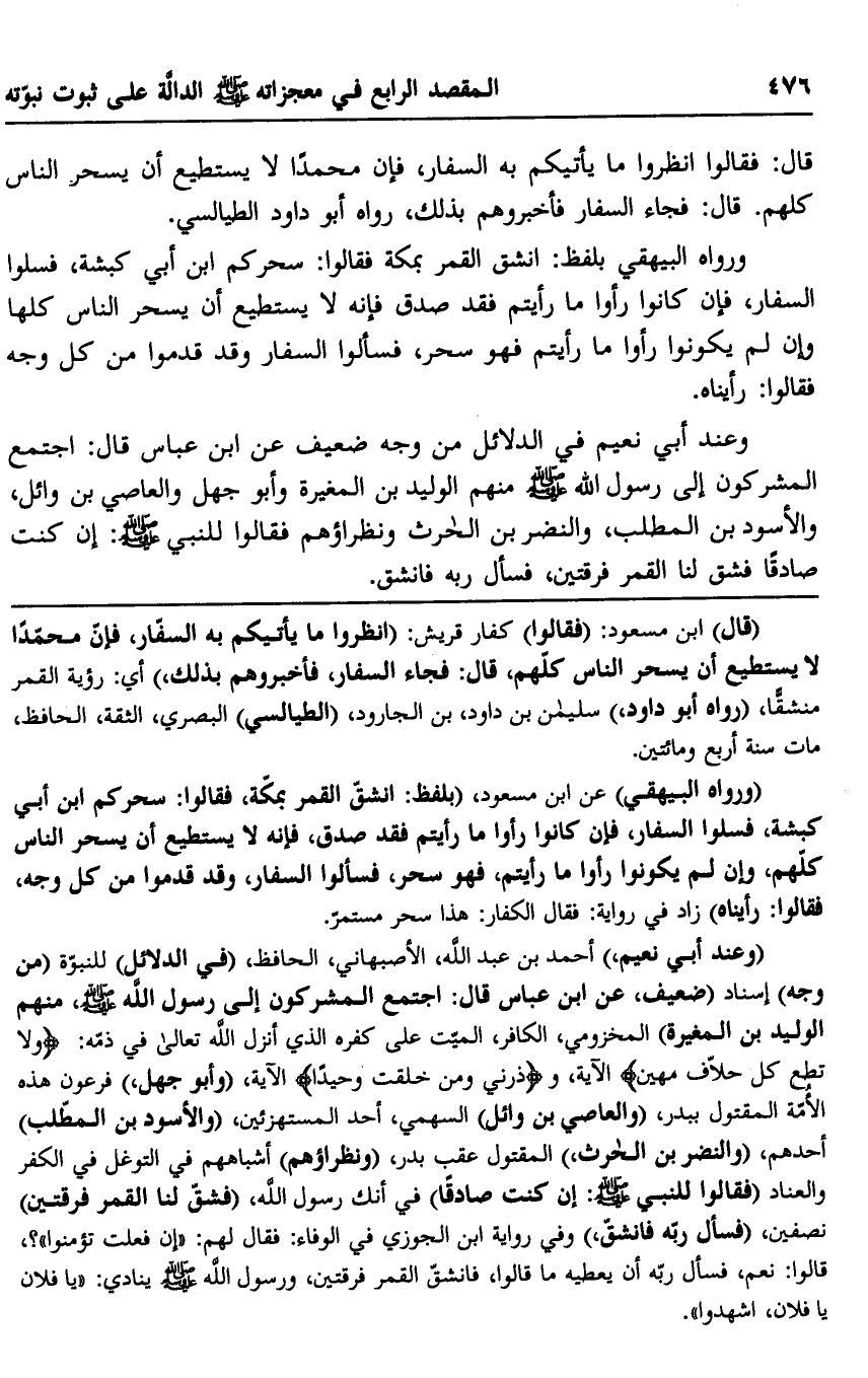 وعند أبي نعيم في الدلائل من وجه ضعيف عن ابن عباس قال: اجتمع المشركون إلى رسول الله -صلى الله عليه وسلم, منهم الوليد بن المغيرة، وأبو جهل, والعاص بن وائل، والأسود بن المطلب، والنضر بن الحارث ونظراؤهم, فقالوا للنبي -صلى الله عليه وسلم: إن كنت صادقًا فشق لنا القمر فرقتين، فسأل ربه فانشق.