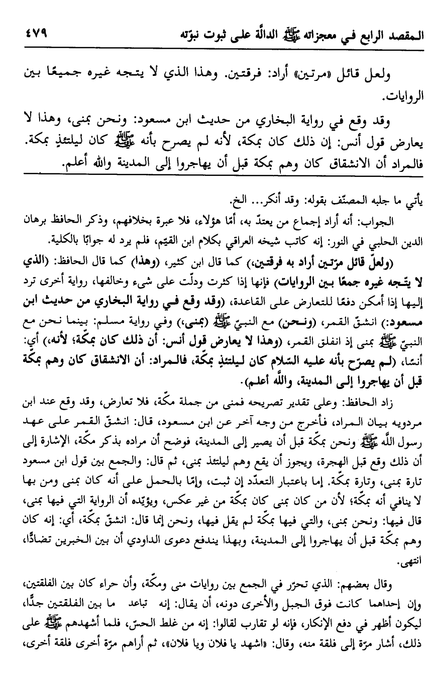 وقد وقع في رواية البخاري من حديث ابن مسعود: ونحن بمنَى، وهذا لا يعارض قول أنس: إن ذلك كان بمكة؛ لأنه لم يصرّح بأنه -صلى الله عليه وسلم- كان ليلتئذ بمكة. فالمراد أن الانشقاق كان وهُمْ بمكة قبل أن يهاجروا إلى المدينة. والله أعلم.
