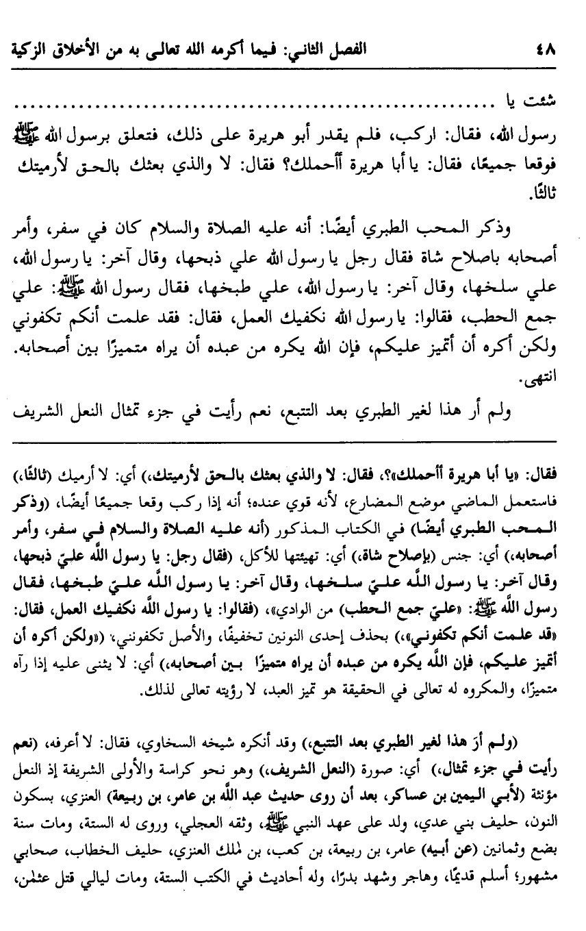 فقال: "يا أبا هريرة أأحملك"؟، فقال: لا والذي بعثك بالحق لأرميتك" أي: لا أرميك "ثالثًا" فاستعمل الماضي موضع المضارع، لأنه قوي عنده؛ أنه إذا ركب وقعا جميعًا أيضًا، "وذكر المحب الطبري أيضًا" في الكتاب المذكور "أنه -عليه الصلاة والسلام- في سفر، وأمر أصحابه" أي: جنس "بإصلاح شاة" أي: تهيئتها للأكل، "فقال رجل: يا رسول الله عليَّ ذبحها، وقال آخر: يا رسول الله علي سلخها، وقال آخر: يا رسول الله عليّ طبخها، فقال رسول الله -صلى الله عليه وسلم: "عليّ جمع الحطب" من الوادي", "فقالوا: يا رسول الله نكفيك العمل، فقال: "قد علمت أنكم تكفوني" بحذف إحدى النونين تخففًا، والأصل تكفونني، "ولكن أكره أن أتميِّزَ عليكم، فإن الله يكره من عبده أن يراه متميزًا بين أصحابه" , أي: لا يثني عليه إذا رآه متميزًا، والمكروه له تعالى في الحقيقة هو تميز العبد، لا رؤيته تعالى لذلك.