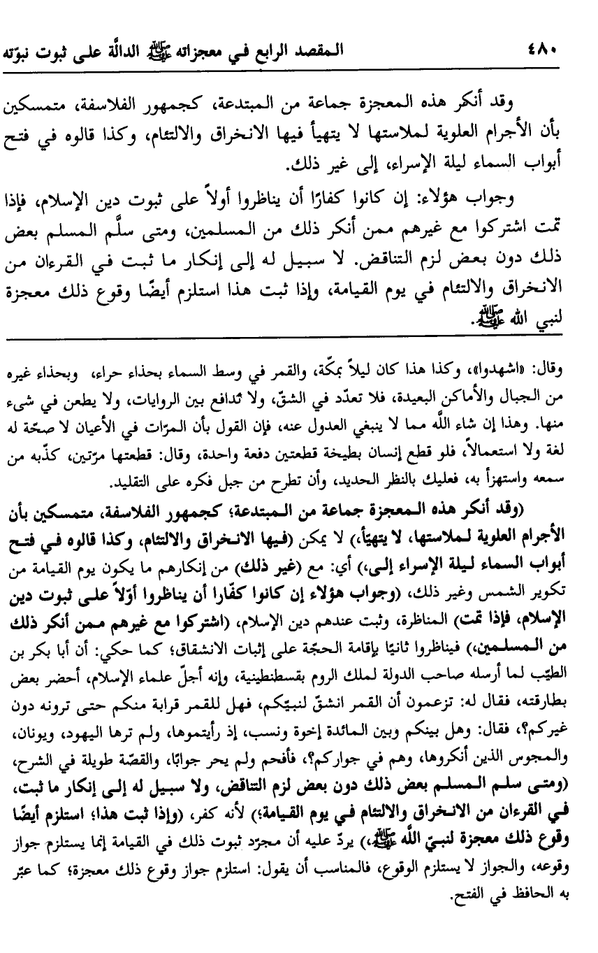 "وقد أنكر هذه المعجزة جماعة من المبتدعة، كجمهور الفلاسفة، متمسكين بأن الأجرام العلوية لملاستها، لا يتهيأ" لا يمكن "فيها الانخراق والالتئام, وكذا قالوه في فتح أبواب السماء ليلة الإسراء إلى" أي: مع "غير ذلك" من إنكارهم ما يكون يوم القيامة من تكوين الشمس، وغير ذلك، "وجواب هؤلاء إن كانوا كفارًا أن يناظروا أولًا على ثبوت دين الإسلام، فإذا تمت" المناظرة، وثبت عندهم دين الإسلام، "اشتركوا مع غيرهم ممن أنكر ذلك من المسلمين", فيناظروا ثانيًا بإقامة الحجة على إثبات الانشقاق، كما حكي أنَّ أبا بكر بن الطيب لما أرسله صاحب الدولة لملك الروم بقسطنطينية، وإن أجَلّ علماء الإسلام، أحضر بعض بطارقته، فقال له: تزعمون أن القمر انشقَّ لنبيكم، فهل للقمر قرابة منكم حتى ترونه دون غيركم؟ فقال: وهل بينكم وبين المائدة إخوة ونسب إذ رأيتموها، ولم ترها اليهود، ويونان، والمجوس الذين أنكروها، وهم في جواركم؟ فأفحم ولم يحر جوابًا، والقصة طويلة في الشرح، "ومتى سلم المسلم بعض ذلك دون بعض لزم التناقض، ولا سبيل له إلى إنكار ما ثبت في القرآن من الانخراق والالتئام في يوم القيامة"؛ لأنه كفر، "وإذا ثبت هذا استلزم أيضًا وقوع ذلك معجزة لنبي الله -صلى الله عليه وسلم, يرد عليه أن مجرد ثبوت ذلك في القيامة إنما يستلزم جواز وقوعه، والجواز لا يستلزم الوقوع، فالمناسب أن يقول: استلزم جواز وقوع ذلك معجزة، كما عبَّر به الحافظ في الفتح.