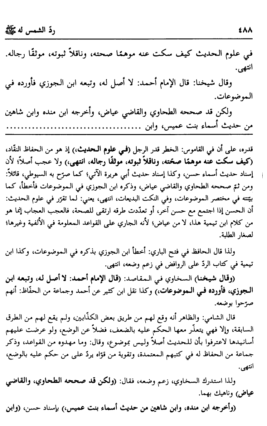 ولذا قال الحافظ في فتح الباري: أخطأ ابن الجوزي بذكره في الموضوعات، وكذا ابن تيمية في كتاب الرد على الروافض في زعم وضعه، انتهى.