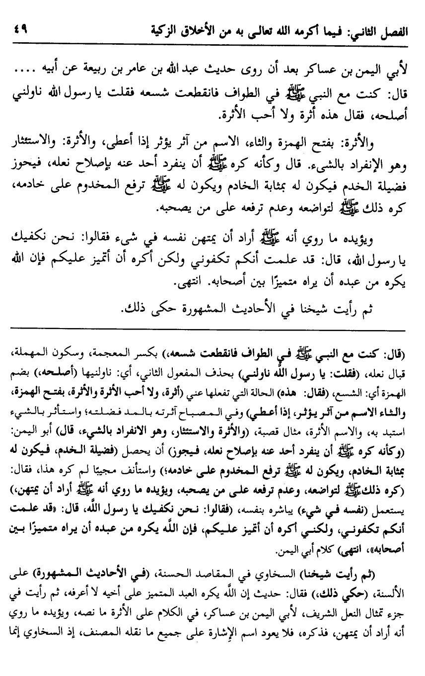 لأبي اليمن بن عساكر بعد أن روى حديث عبد الله بن عامر بن ربيعة عن أبيه....... قال: كنت مع النبي -صلى الله عليه وسلم- في الطواف, فانقطعت شسعه, فقلت: يا رسول الله, ناولني أصلحه، فقال: "هذه أثرة ولا أحب الأثرة".