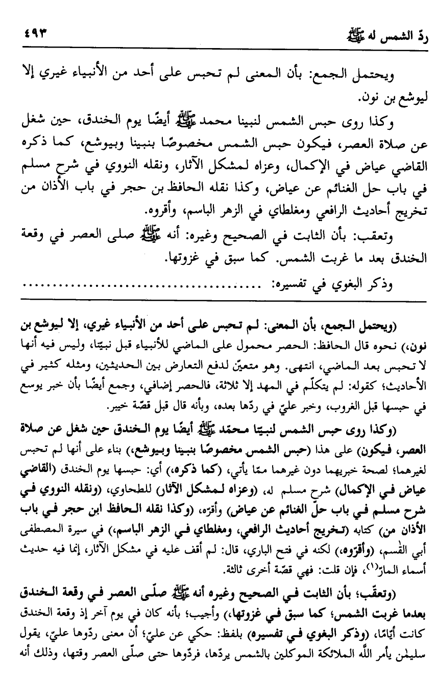 وكذا روى حبس الشمس لنبينا محمد -صلى الله عليه وسلم- أيضًا يوم الخندق، حين شغل عن صلاة العصر، فيكون حبس الشمس مخصوصًا بنبينا وبيوشع، كما ذكره القاضي عياض في الإكمال، وعزاه لمشكل الآثار، ونقله النووي في شرح مسلم في باب حلّ الغنائم عن عياض، وكذا نقله الحافظ بن حجر في باب الأذان من تخريج أحاديث الرافعي, ومغلطاي في الزهر الباسم، وأقروه.