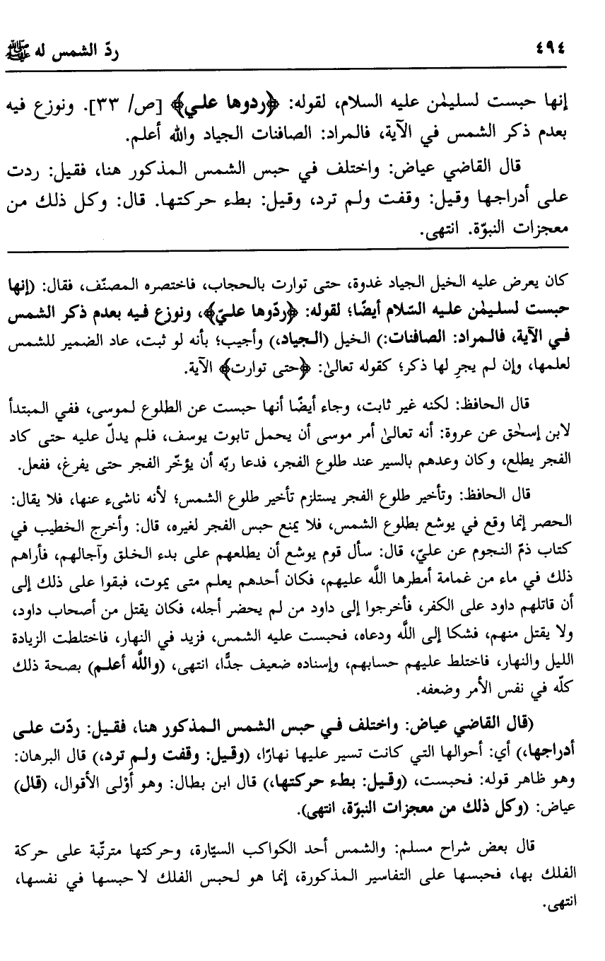 قال القاضي عياض: واختلف في حبس الشمس المذكور هنا، فقيل: ردت على أدراجها, وقيل: وقفت ولم ترد، وقيل: بطء حركتها. قال: وكل ذلك من معجزات النبوة. انتهى.