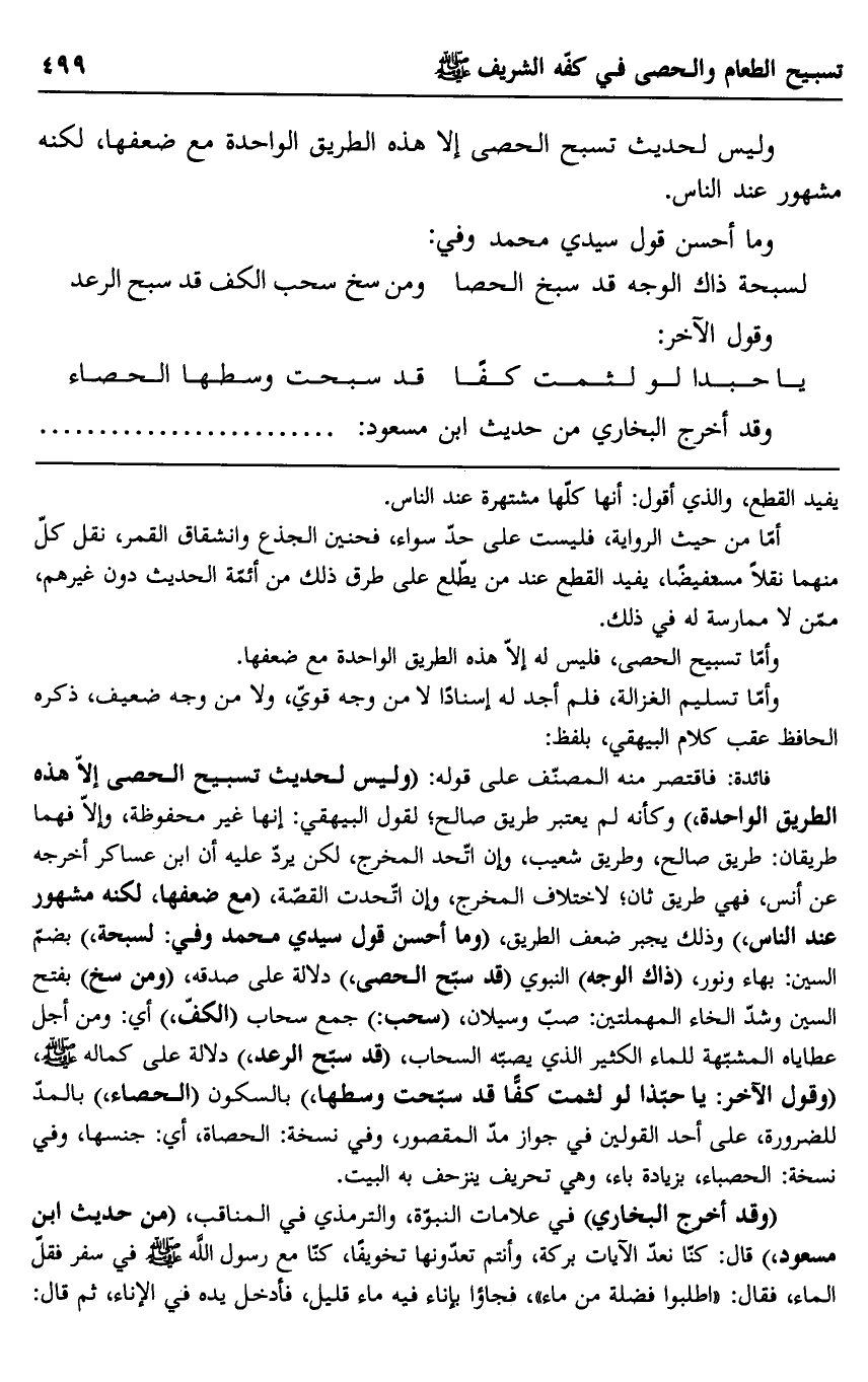 فائدة: فاقتصر منه المصنف على قوله: "وليس لحديث تسبيح الحصى إلّا هذه الطريق الواحدة، وكأنه لم يعتبر طريق صالح لقول البيهقي: إنها غير محفوظة وإلا فهما طريقان, طريق صالح وطريق شعيب, وإن اتحد المخرج, لكن يرد عليه أنَّ ابن عساكر أخرجه عن أنس فهي طريق ثانٍ، لاختلاف المخرج، وإن اتحدت القصة, "مع ضعفها, لكنه مشهور عند الناس", وذلك يجبر ضعف الطريق، وما أحسن قول سيدي محمد وفي: لسبحة "بضم السين: بهاء ونور, "ذاك الوجه" النبوي "قد سبح الحصى" دلالة على صدقه, "ومن سخ" بفتح السين وشد الخاء المهملتين: صب وسيلان, "سحب" جمع سحاب, "الكف" أي: ومن أجل عطاياه المشبه للماء الكثير الذي يصبّه السحاب, "قد سبّح الرعد" دلالة على كماله -صلى الله عليه وسلم, "وقول الآخر: يا حبذا لو لثمت كفًّا قد سبحت وسطها" بالسكون "الحصاء" بالمد للضروة على أحد القولين في جواز مد المقصور, وفي نسخة الحصاة أي: جنسها, وفي نسخة الحصباء بزيادة باء, وهي تحريف, ينزحف به البيت.