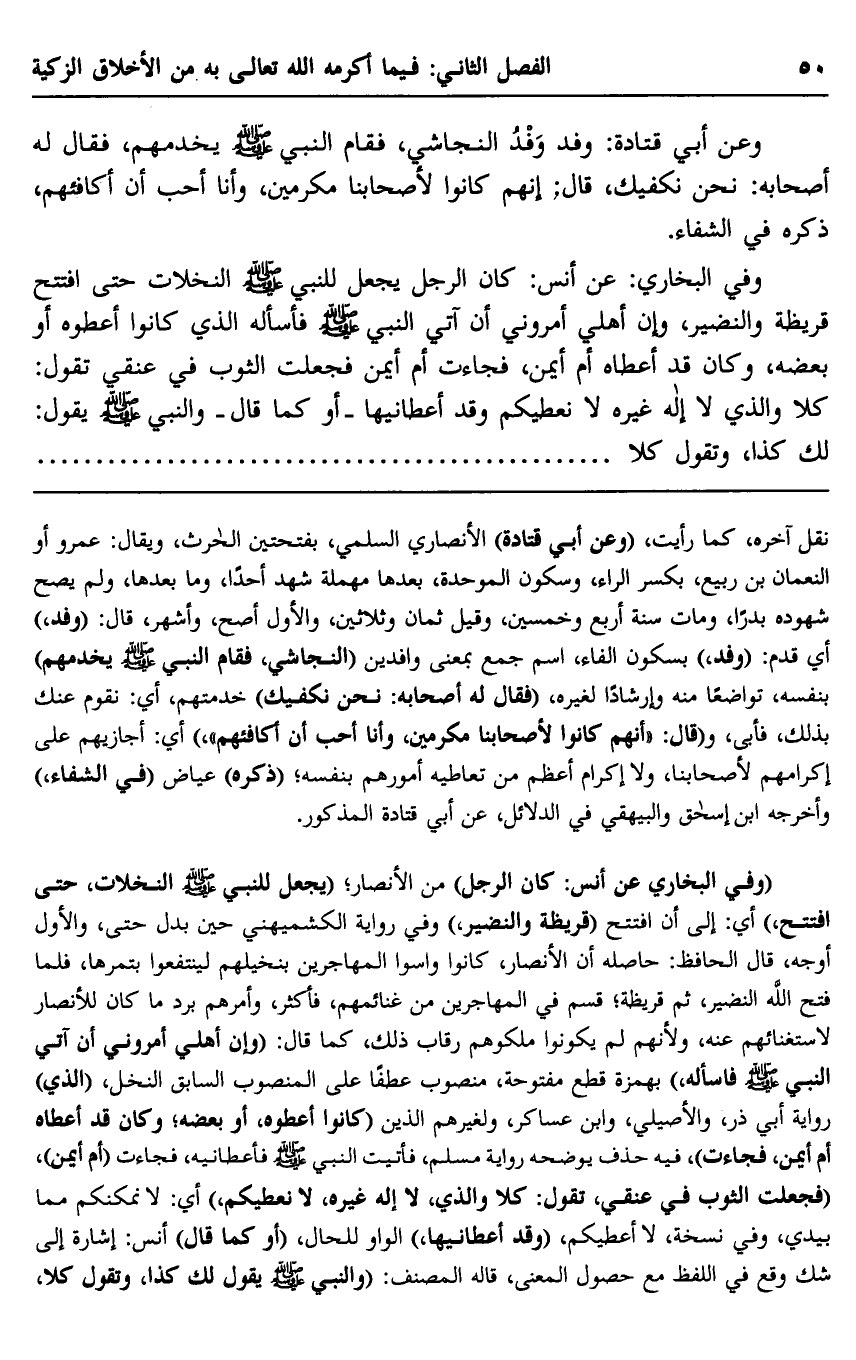 وعن أبي قتادة: وَفَدَ وَفْدُ النجاشي، فقام النبي -صلى الله عليه وسلم- يخدمهم، فقال له أصحابه: نحن نكفيك، قال: "إنهم كانوا لأصحابنا مكرمين، وأنا أحب أن أكافئهم"، ذكره في الشفاء.