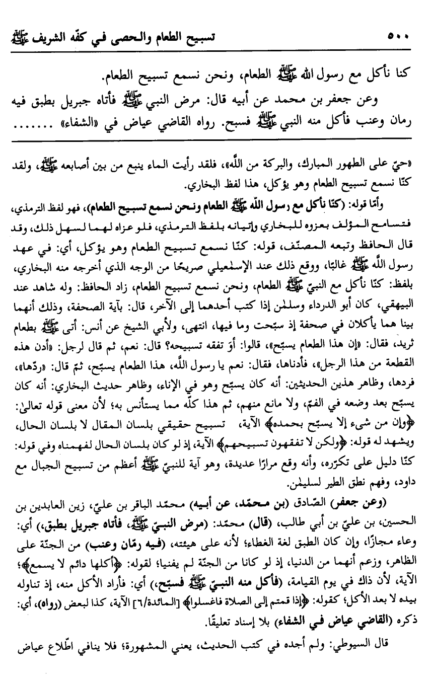 وعن جعفر بن محمد عن أبيه قال: مرض النبي -صلى الله عليه وسلم, فأتاه جبريل بطبق فيه رمان وعنب فأكل منه النبي -صلى الله عليه وسلم- فسبح. رواه القاضي عياض في "الشفاء"............