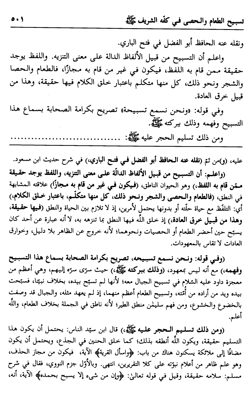 "ومن ذلك تسليم الحجر عليه -صلى الله عليه وسلم" قال ابن سيد الناس: يحتمل أن يكون هذا التسليم حقيقة، ويكون الله أنطقه بذلك، كما خلق الحنين في الجذع، ويحتمل أن يكون مضافًا إلى ملائكة يسكنون هناك من باب: {وَاسْأَلِ الْقَرْيَةَ} الآية. فيكون من مجاز الحذف، وهو علم ظاهر من أعلام نبوّته على كلا التقريرين، انتهى، وبالأوّل جزم النووي، فقال في شرح مسلم: سلامه حقيقة، وقيل في قوله تعالى: {وَإِنْ مِنْ شَيْءٍ إِلَّا يُسَبِّحُ بِحَمْدِهِ} الآية. أنه