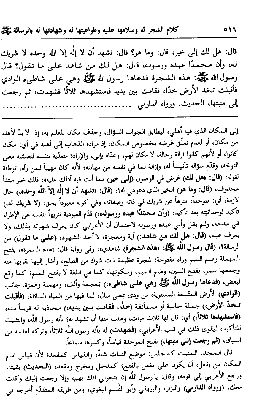 قال: "هل لك إلى خير"، قال: وما هو؟ قال: "تشهد أن لا إله إلا الله وحده لا شريك له، وأن محمدًا عبده ورسوله"، قال: هل لك من شاهد على ما تقول؟ قال رسول الله -صلى الله عليه وسلم: "هذه الشجرة" , فدعاها رسول الله -صلى الله عليه وسلم, وهي على شاطيء الوادي, فأقبلت تخدّ الأرض خدًّا، فقامت بين يديه فاستشهدها ثلاثًا فشهدت، ثم رجعت إلى منبتها. الحديث رواه الدارمي........