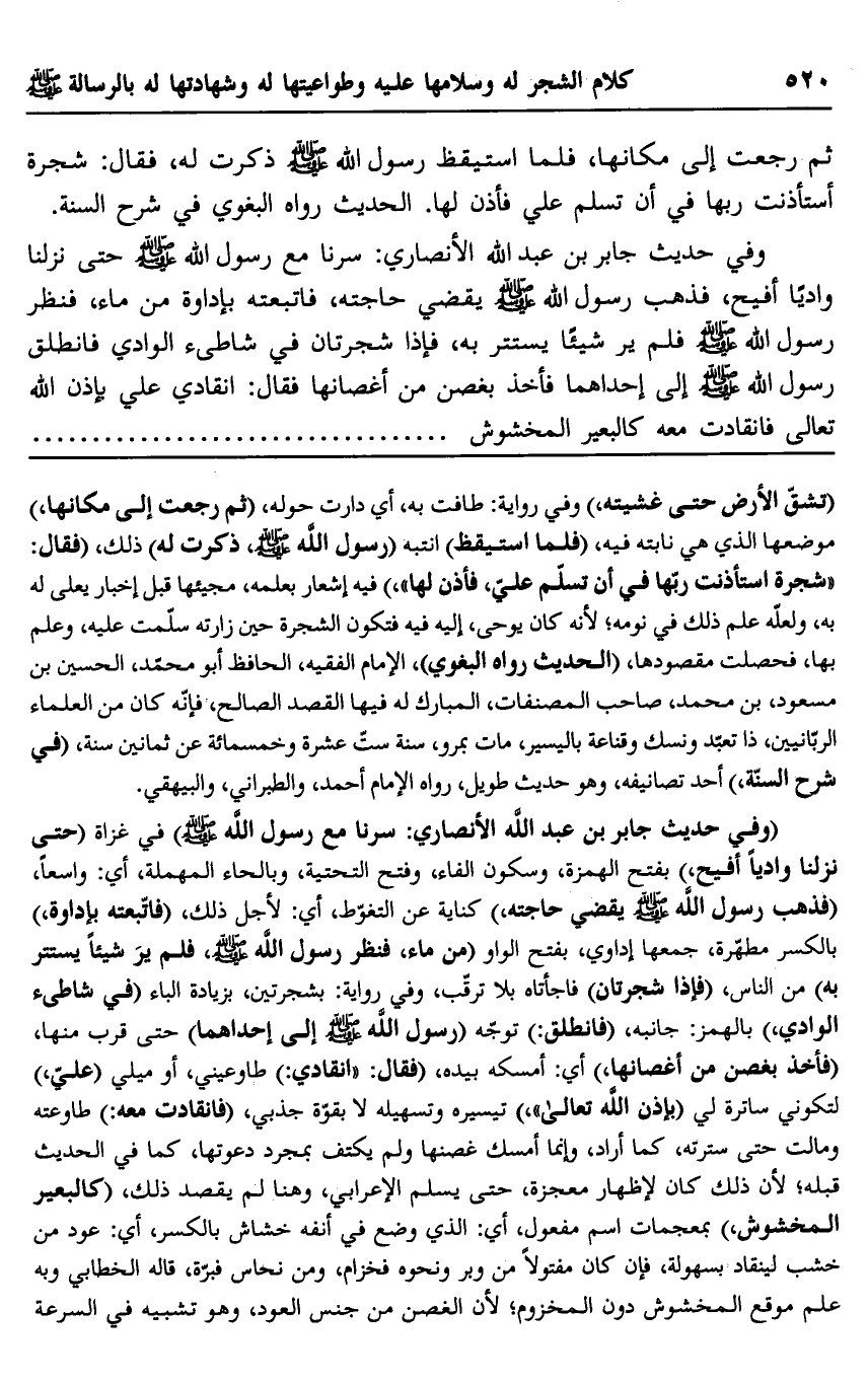 "وفي حديث جابر بن عبد الله الأنصاري: سرنا مع رسول الله -صلى الله عليه وسلم" في غزاة حتى نزلنا واديًا أفيح،" بفتح الهمزة، وسكون الفاء، وفتح التحتية، وبالحاء المهملة، أي: واسعًا، فذهب رسول الله -صلى الله عليه وسلم- يقضي حاجته" كناية عن التغوّط، اي: لأجل ذلك، "فاتبعته بإداوة" بالكسر مطهرة، جمعها إداوي -بفتح الواو "من ماء, فنظر رسول الله -صلى الله عليه وسلم" فلم ير شيئًا يستتر به" من الناس, "فإذا شجرتان" فاجأتاه بلا ترقب، وفي رواية: بشجرتين، بزيادة الباء "في شاطيء الوادي،" بالهمز: جانبه، "فانطق" توجه رسول الله -صلى الله عليه وسلم- إلى أحداهما" حتى قرب منها "فأخذ بغصن من أغصائها"، أي: أمسكه بيده، "فقال: "انقادي" طاوعيني، أو ميلي "علي" لتكوني ساترة لي "بإذن الله تعالى" تيسيره وتسهيله لا بقوة جذبي، "فانقادت معه:" طاوعته ومالت حتى سترته، كما أراد، وإنما أمسك غصنها, ولم يكتف بمجرد دعوتها، كما في الحديث قبله؛ لأن ذلك كان الإظهار معجزة، حتى يسلم الإعرابي، وهنا لم يقصد ذلك، "كالبعير المخشوش" بمعجمات اسم مفعول، أي: الذي وضع في أنفه خشاش بالكسر، أي: عود من خشب لينقاد بسهولة، فإن كان مفتولًا من وبر ونحوه فخزام، ومن نحاس فبرّة. قاله الخطابي وبه علم موقع المخشوش دون المخزوم؛ لأن الغصن من جنس العود، وهو تشبيه في السرعة