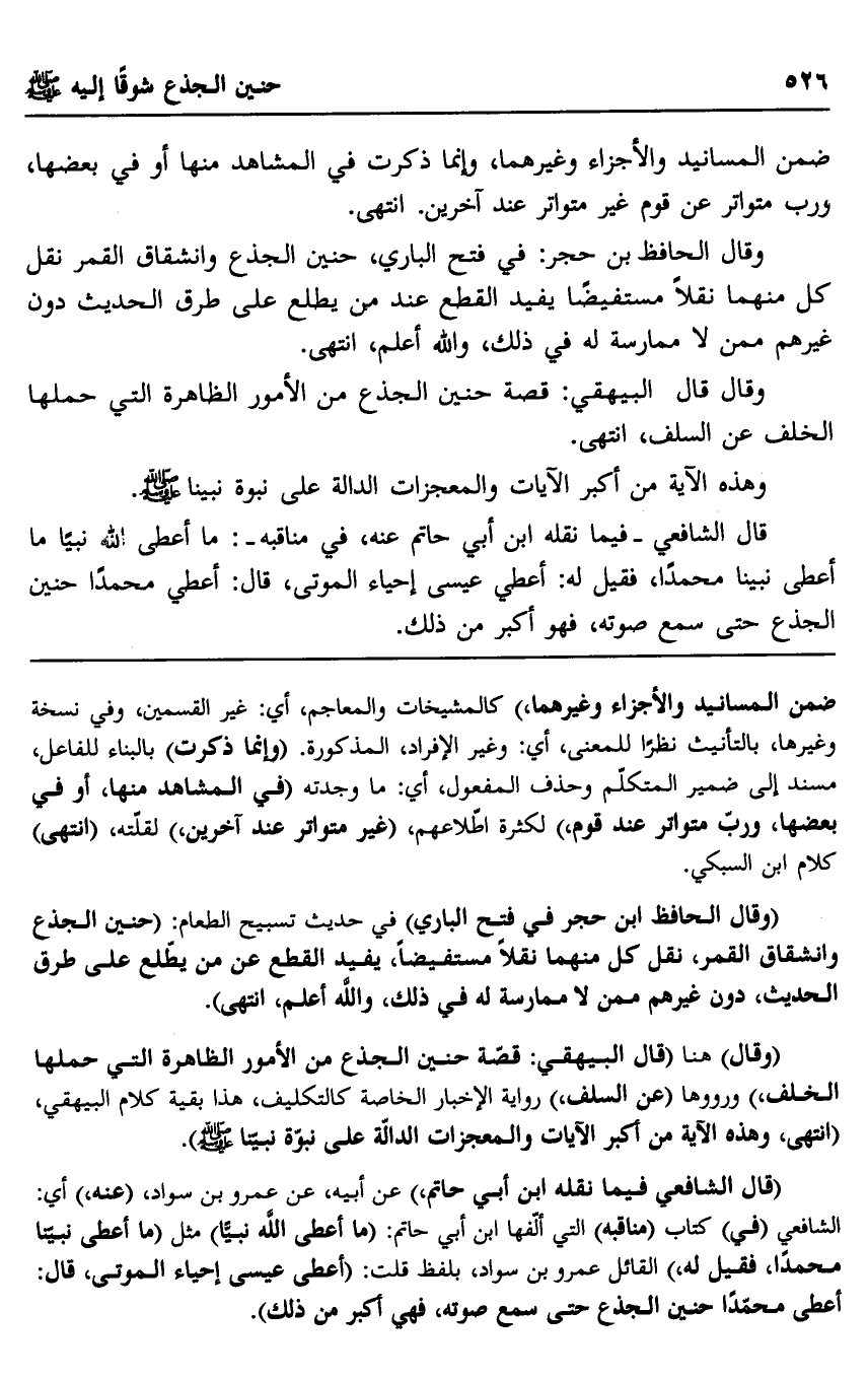 وقال الحافظ بن حجر في فتح الباري: حنين الجذع وانشقاق القمر نقل كلّ منهما نقلًا مستفيضًا يفيد القطع عند من يطّلع على طرق الحديث دون غيرهم ممن لا ممارسة له في ذلك، والله أعلم، انتهى.
