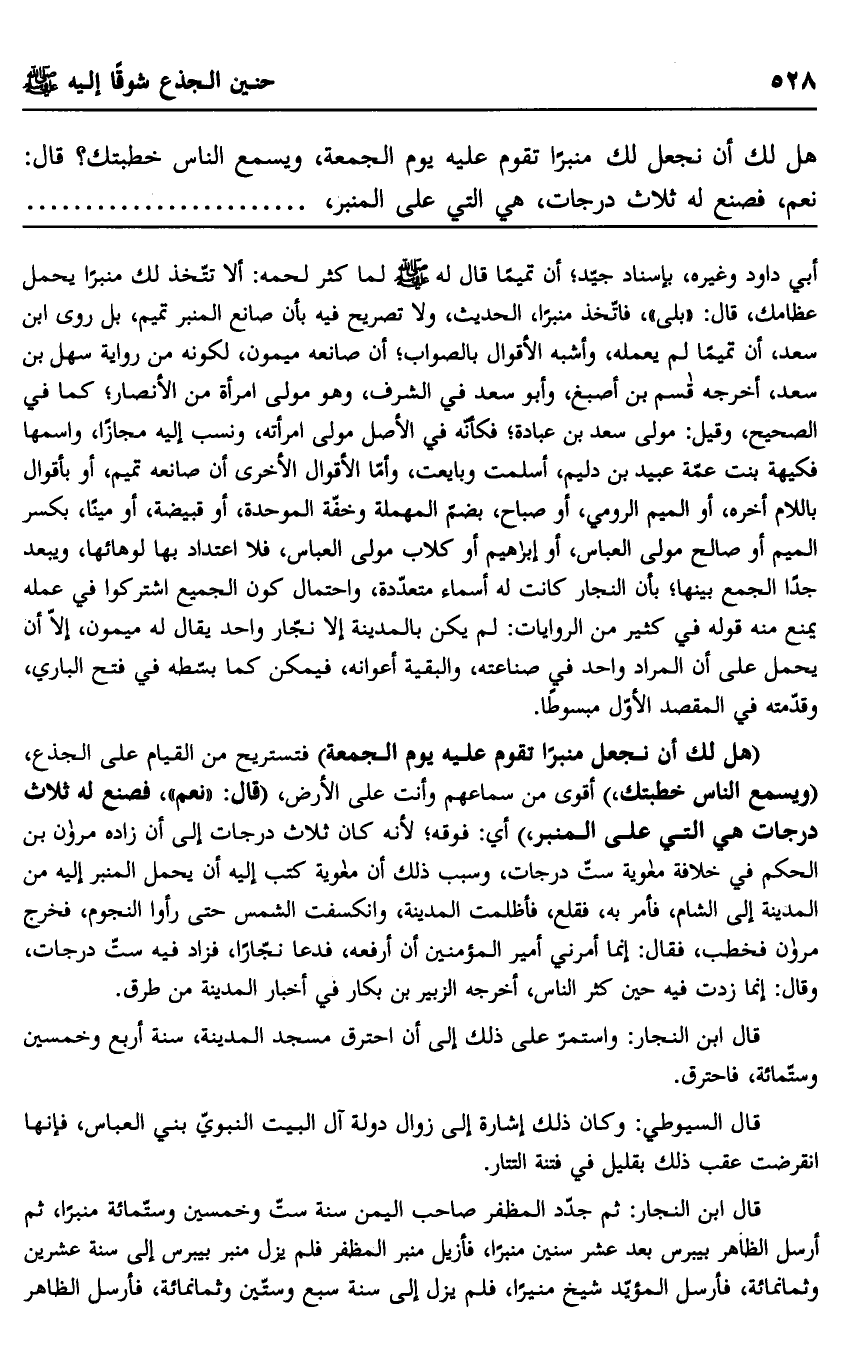 "هل لك أن نجعل منبرًا تقوم عليه يوم الجمعة", فتستريح من القيام على الجذع، ويسمع الناس خطبتك" أقوى من سماعهم وأنت على الأرض، "قال: "نعم" , فصنع له ثلاث درجات هـ التي على المنبر، أي: فوقه؛ لأنه كان ثلاثة درجات إلى أن زاده مروان بن الحكم في خلافة معاوية ست درجات, وسبب ذلك أن معاوية كتب إليه أن يحمل المنبر إليه من المدينة إلى الشام، فأمر به، فقلع فأظلمت المدينة، وانكسفت الشمس حتى رأو النجوم, فخرج مروان فخطب فقال: إنما أمرني أمير المؤمنين أن أرفعه، فدعا نجارًا، فزاد فيه ست درجات، وقال: إنما زدت فيه حين كثر الناس، أخرجه الزبير بن بكار في أخبار المدينة من طرق.
