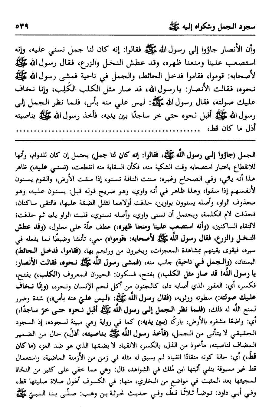 وأن الأنصار جاءوا إلى رسول الله -صلى الله عليه وسلم- فقالوا: إنه كان لنا جمل نسني عليه، وإنه استصعب علينا ومنعنا ظهره، وقد عطش النخل والزرع، فقال رسول الله -صلى الله عليه وسلم- لأصحابه: "قوموا"، فقاموا فدخل الحائط، والجمل في ناحية فمشى رسول الله -صلى الله عليه وسلم- نحوه، فقالت الأنصار: يا رسول الله، قد صار مثل الكلب الكَلِب، وإنا نخاف عليك صولته، فقال رسول الله -صلى الله عليه وسلم: "ليس علي منه بأس"، فلما نظر الجمل إلى رسول الله -صلى الله عليه وسلم- أقبل نحوه حتى خَرَّ ساجدًا بين يديه، فأخذ رسول الله -صلى الله عليه وسلم- بناصيته أذل ما كان قط،......................................
