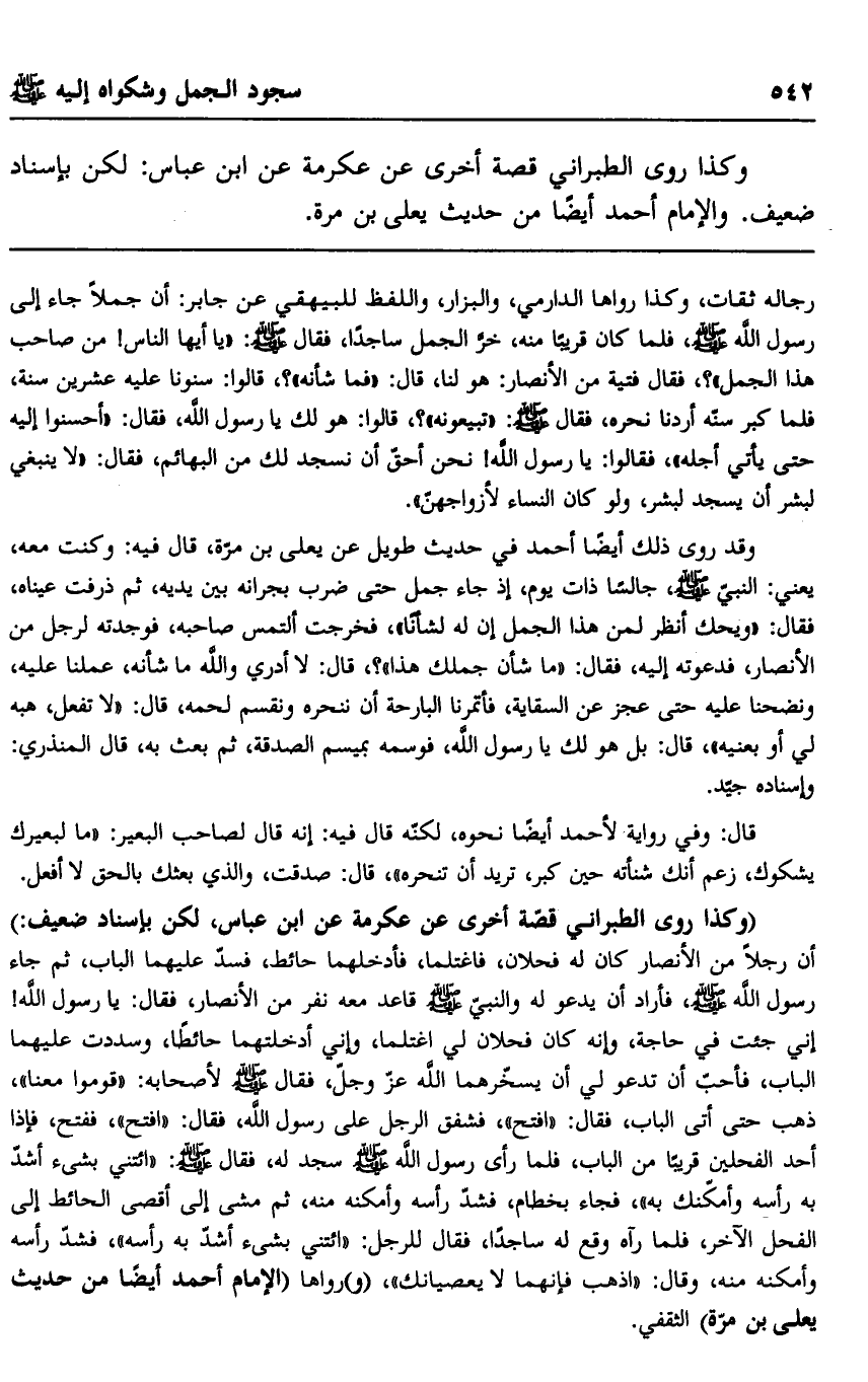 "وكذا روى الطبراني قصة أخرى عن عكرمة عن ابن عباس، لكن بإسناد ضعيف:" أن رجلًا من الأنصار كان له فحلان، فاغتلما، فأدخلهما حائط، فسد عليهما الباب، ثم جاء رسول الله -صلى الله عليه وسلم، فأراد أن يدعو له, والنبي -صلى الله عليه وسلم- قاعد معه نفر من الأنصار، فقال: يا رسول الله! إني جئت في حاجة، وإنه كان فحلان لي اغتلما، وإني أدخلتهما حائطًا، وسددت عليهما الباب، فأحب أن تدعو لي أن يسخرهما الله -عز وجل، فقال -صلى الله عليه وسلم- لأصحابه: "قوموا معنا"، ذهب حتى أتى الباب، فقال: "افتح" , فشفق الرجل على رسول الله، فقال: "افتح" ففتح، فإذا أحد الفحلين قريبًا من الباب، فلمَّا رأى رسول الله -صلى الله عليه وسلم- سجد له، فقال -صلى الله عليه وسلم: "ائتني بشيء أشد به رأسه وأمكنك به" فجاء بخطام فشد رأسه وأمكنه منه، ثم مشى إلى أقصى الحائط إلى الفحل الآخر، فلمَّا رآه وقع له ساجدًا، فقال للرجل: "ائتني بشيء أشد به رأسه"، فشد رأسه وأمكنه منه، وقال: "اذهب فإنهما لا يعصيانك" , ورواها "الإمام أحمد أيضًا من حديث يعلى بن مرة" الثقفي.