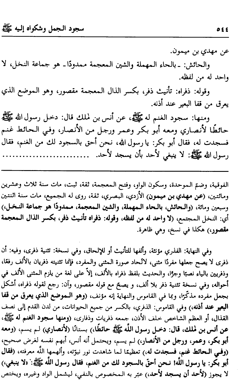 وفي النهاية: الفذري مؤنثة، وألفها للتأنيث أو للإلحاق، وفي نسخة: تثنية ذفري، وفيه: إن ذفرى لايصح جعلها مفردًا مثنى، لاتحاد صورة المثنى والمفرد، فإنما تثنيته ذفريان بالألف رفعًا، وذفريين بالياء نصبًا وجرًّا، والحديث بلفظ ذفراه بالألف, إلّا على لغة من يلزم المثنى الألف في أحواله، وفي نسخة تثنية ذفر بلا ألف، ويصح مع قوله مقصور، وآن: رجع لقوله ذفراه، أشكل يجعل مفرده مذكرًا, وبما في القاموس والنهاية إنه مؤنف، "وهو الموضع الذي يعرق من قفا البعير عند أذنه", وفي القاموس: الذفري، بالكسر من جميع الحيوانات، من لدن القدم إلى نصف القذال، أو العظم الشاخص خلف الأذن، جمعه ذفريات وذفاري، "ومنها سجود الغنم له -صلى الله عليه وسلم، عن أنس بن مالك، قال: دخل رسول الله -صلى الله عليه وسلم- حائطًا" بستانًا "لأنصاري" لم يسمّ، ومعه أبو بكر، وعمر، ورجل من الأنصار" لم يسمّ, ويحتمل أنه أنس، أَبْهَمَ نفسه لغرض صحيح، وفي الحائط غنم، فسجدت له" تعظيمًا لما شاهدت نور نبوته، وألهمها الله معرفته، "فقال أبو بكر: يا رسول الله! نحن أحق بالسجود لك من الغنم، فقال رسول الله -صلى الله عليه وسلم: "لا ينبغي" لا يجوز "لأحد أن يسجد لأحد" عبَّر به المخصوص بالنفي، ليشمل الواد وغيره، ويختص