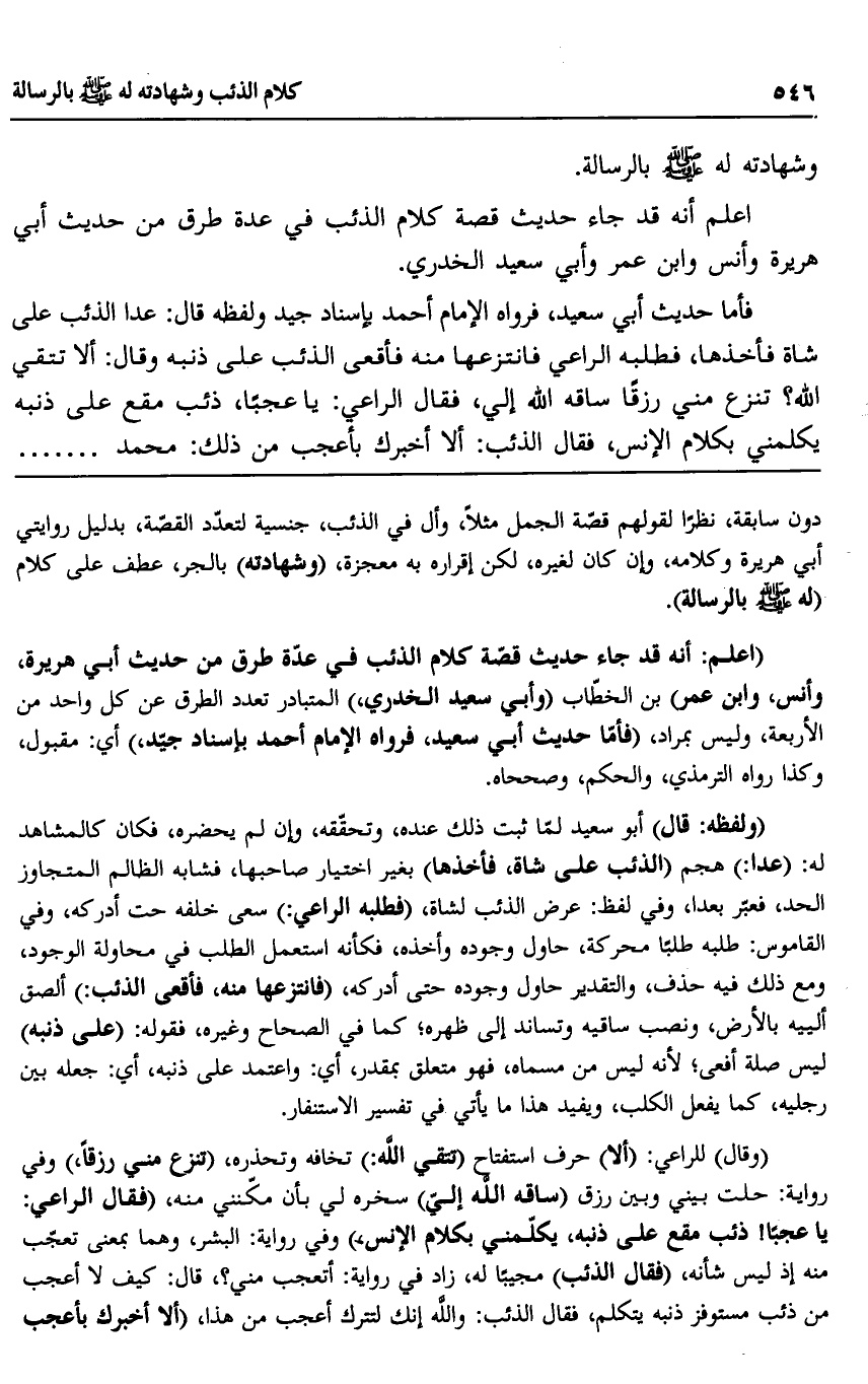 فأما حديث أبي سعيد، فرواه الإمام أحمد بإسناد جيد, ولفظه قال: عدا الذئب على شاة فأخذها، فطلبه الراعي فانتزعها منه, فأقعى الذئب على ذنب وقال: ألا تتقي الله؟ تنزع مني رزقًا ساقه الله إلي، فقال الراعي: يا عجبًا، ذئب مقع على ذنبه يكلمني بكلام الإنس، فقال الذئب: ألا أخبرك بأعجب من ذلك: محمد.......................................