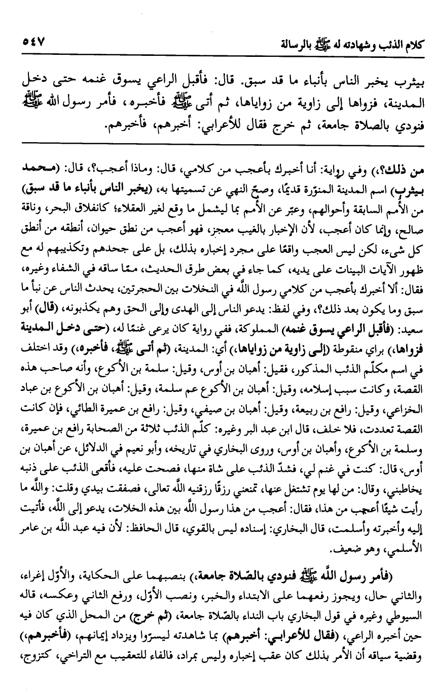 بيثرب يخبر الناس بأنباء ما قد سبق. قال: فأقبل الراعي يسوق غنمه حتى دخل المدينة، فزواها إلى زاوية من زواياها، ثم أتى -صلى الله عليه وسلم- فأخبره، فأمر رسول الله -صلى الله عليه وسلم, فنودي بالصلاة جامعة، ثم خرج فقال للأعرابي: "أخبرهم" فأخبرهم.