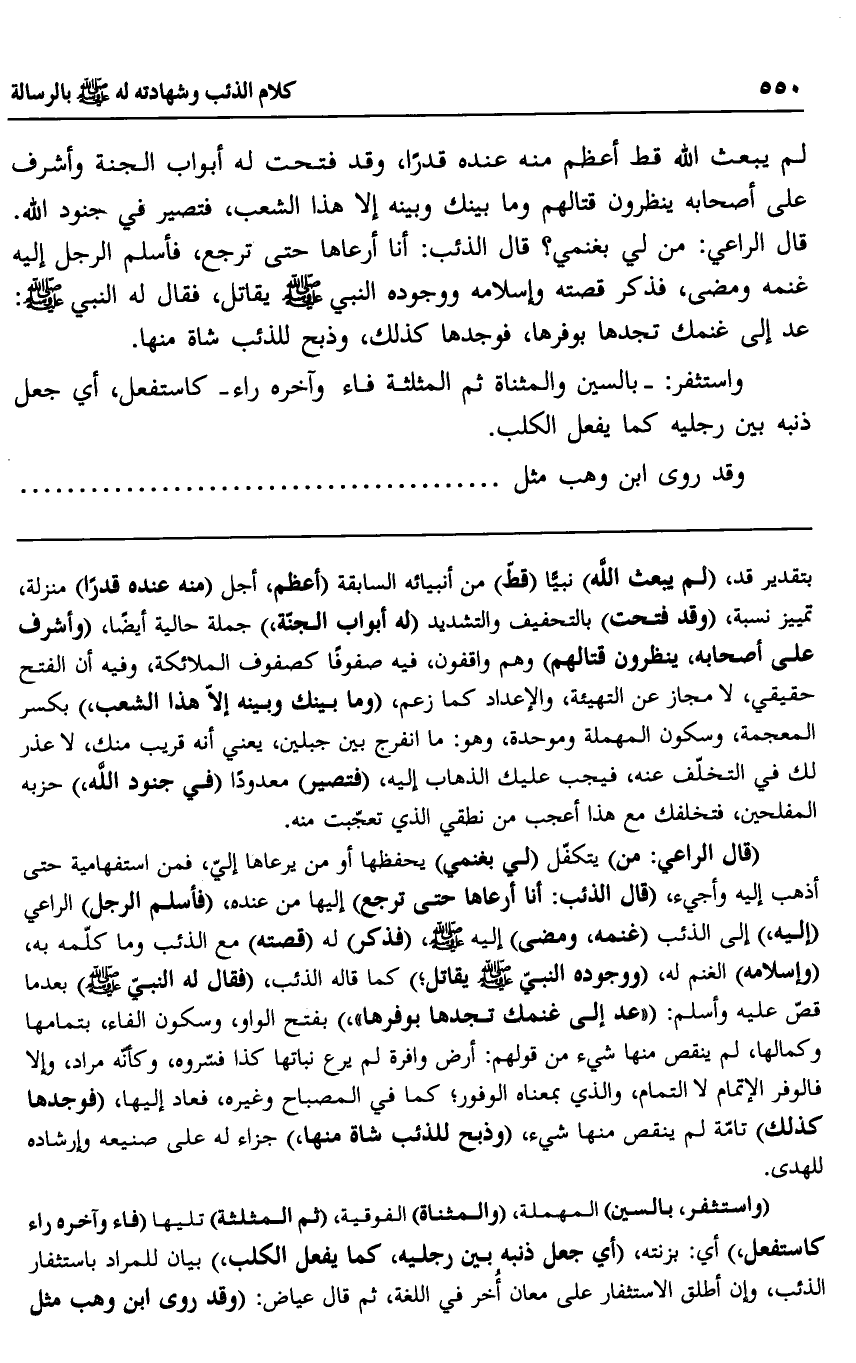 لم يبعث الله قط أعظم منه عنده قدرًا، وقد فتحت له أبواب الجنة وأشرف على أصحابه ينظرون قتالهم, وما بينك وبينه إلّا هذا الشِّعْب، فتصير في جنود الله. قال الراعي: من لي بغنمي؟ قال الذئب: أنا أرعاها حتى ترجع، فأسلم الرجل إليه غنمه ومضى، فذكر قصته وإسلامه ووجوده النبي -صلى الله عليه وسلم يقاتل، فقال له النبي -صلى الله عليه وسلم: "عد إلى غنمك تجدها بوفرها، فوجدها كذلك، وذبح للذئب شاة منها".