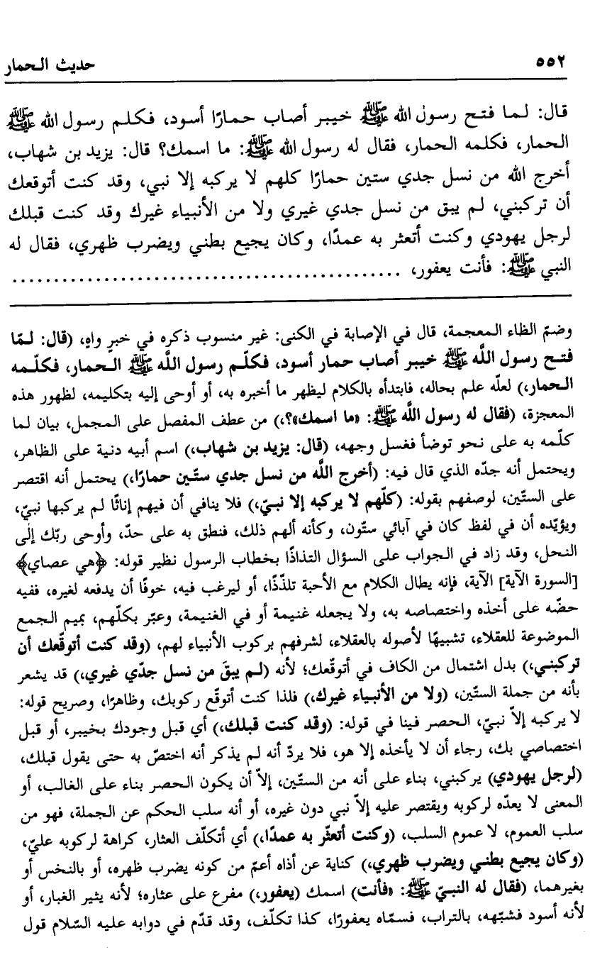 ومن ذلك حديث الحمار: أخرج ابن عساكر عن أبي منظور، قال: لما فتح رسول الله -صلى الله عليه وسلم- خيبر, أصاب حمارًا أسود، فكلّم رسول الله -صلى الله عليه وسلم- الحمار، فكلمه الحمار، فقال له رسول الله -صلى الله عليه وسلم: "ما اسمك؟ " قال: يزيد بن شهاب، أخرج الله من نسل جدي ستين حمارًا كلهم لا يركبه إلّا نبي، وقد كنت أتوقعك أن تركبني، لم يبق من نسل جدي غيري, ولا من الأنبياء غيرك, وقد كنت قبلك لرجل يهودي, وكنت أتعثّر به عمدًا، وكان يجيع بطني ويضرب ظهري، فقال له النبي -صلى الله عليه وسلم: "فأنت يعفور،..............................................