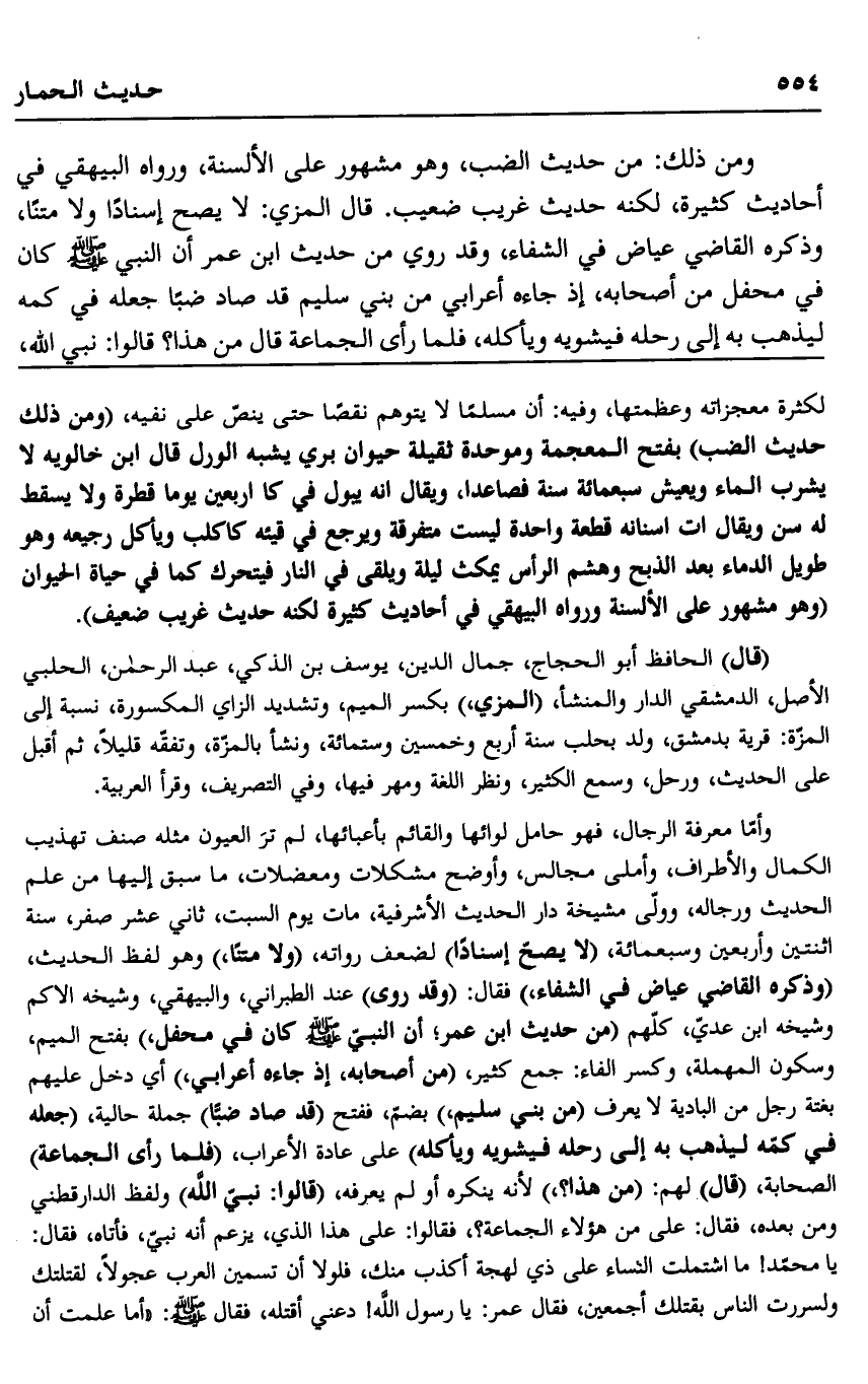 ومن ذلك: من حديث الضب، وهو مشهور على الألسنة، ورواه البيهقي في أحاديث كثيرة، لكنه حديث غريب ضعيف. قال المزي: لا يصح إسنادًا ولا متنًا، وذكره القاضي عياض في الشفاء، وقد روي من حديث ابن عمر أن النبي -صلى الله عليه وسلم- كان في محفل من أصحابه؛ إذ جاءه أعرابي من بني سليم قد صاد ضبًّا جعله في كمّه؛ ليذهب به إلى رحله فيشويه ويأكله، فلمَّا رأى الجماعة قال: من هذا؟ قالوا: نبي الله،