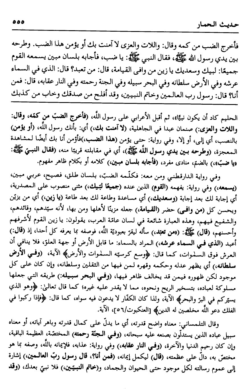 فأخرج الضب من كمه وقال: واللات والعزى لا آمن بك أو يؤمن هذا الضب. وطرحه بين يدي رسول الله -صلى الله عليه وسلم، فقال النبي -صلى الله عليه وسلم: "يا ضب"، فأجابه بلسان مبين يسمعه القوم جميعًا: لبيك وسعديك يا زين من وافى القيامة، قال: "من تعبد؟ " قال: الذي في السماء عرشه, وفي الأرض سلطانه, وفي البحر سبيله, وفي الجنة رحمته, وفي النار عقابه. قال: "فمن أنا؟ قال: رسول رب العالمين وخاتم النبيين، وقد أفلح من صدَّقك وخاب من كذَّبك,