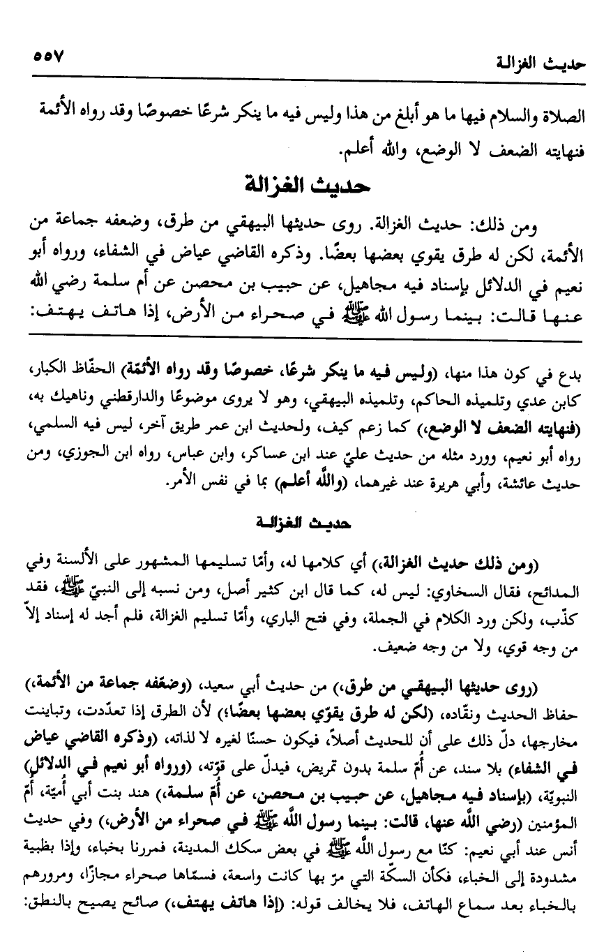 "ومن ذلك حديث الغزالة" أي: كلامها له، وأمَّا تسليمها المشهور على الألسنة وفي المدائح, فقال السخاوي: ليس له -كما قال ابن كثير- أصل، ومن نسبه إلى النبي -صلى الله عليه وسلم- فقد كذب، ولكن ورد الكلام في الجملة، وفي فتح الباري، وأمَّا تسليم الغزالة، فلم أجد له إسناد إلّا من وجه قوي، ولا من وجه ضعيف.