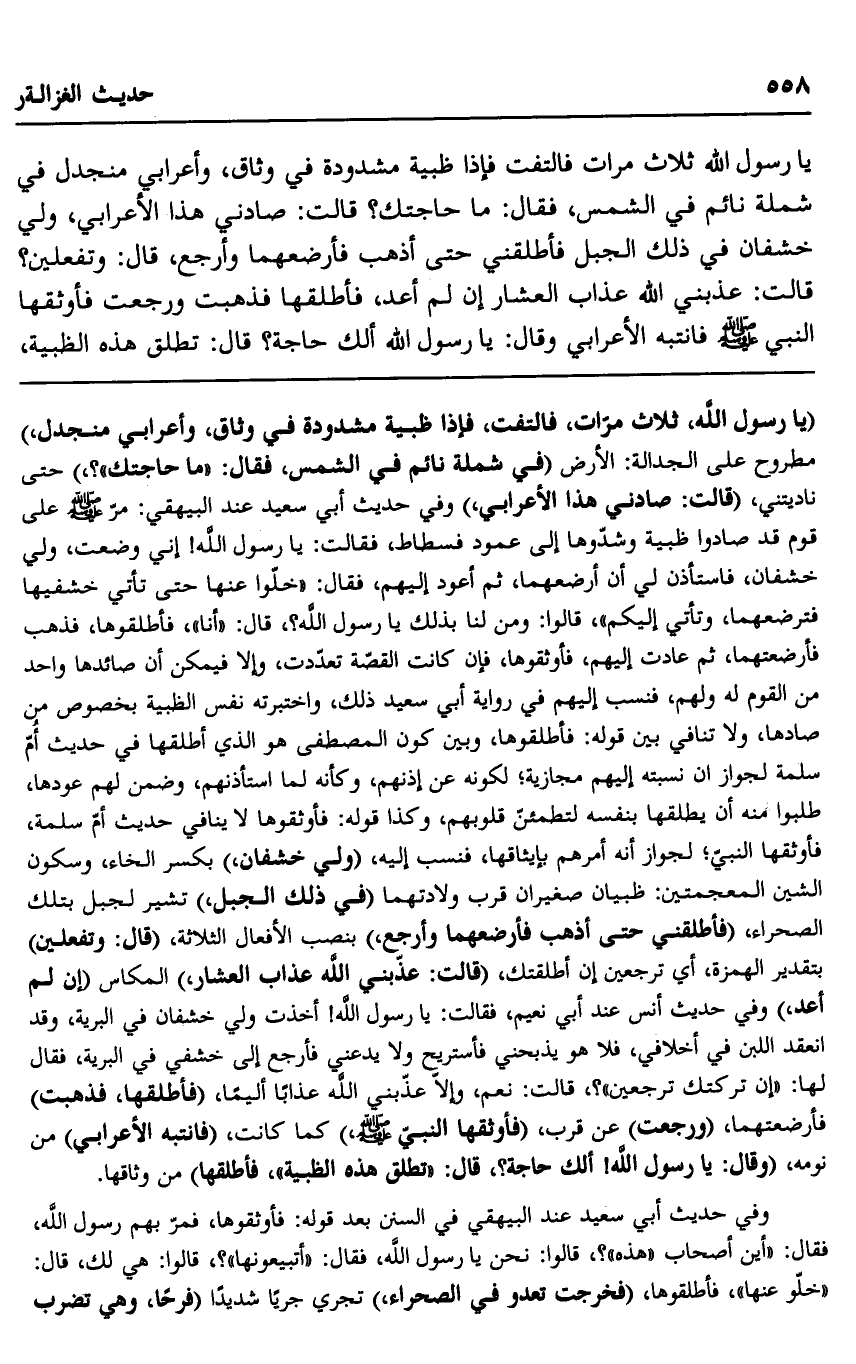 يا رسول الله, ثلاث مرات, فالتفت فإذا ظبية مشدودة في وثاق، وأعرابي منجدل في شملة نائم في الشمس، فقال: "ما حاجتك؟ " قالت: صادني هذا الأعرابي، ولي خشفان في ذلك الجبل فأطلقني حتى أذهب فأرضعهما وأرجع، قال: "وتفعلين؟ " قالت: عذبني الله عذاب العشار إن لم أعد, فأطلقها فذهبت ورجعت, فأوثقها النبي -صلى الله عليه وسلم, فانتبه الأعرابي وقال: يا رسول الله, ألك حاجة؟ قال: "تطلق هذه الظبية،