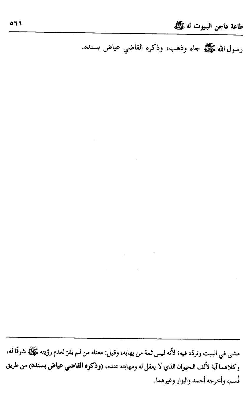 مشى في البيت وتردَّد فيه؛ لأنه ليس ثمة من يهابه, وقيل: معناه من لم يقر لعدم رؤيته -صلى الله عليه وسلم- شوقًا له، وكلاهما آية لألف الحيوان الذي لا يعقل له ومهابته، عنده، "وذكره القاضي عياض بسنده" من طريق قسم, وأخرجه أحمد والبزار وغيرهما.