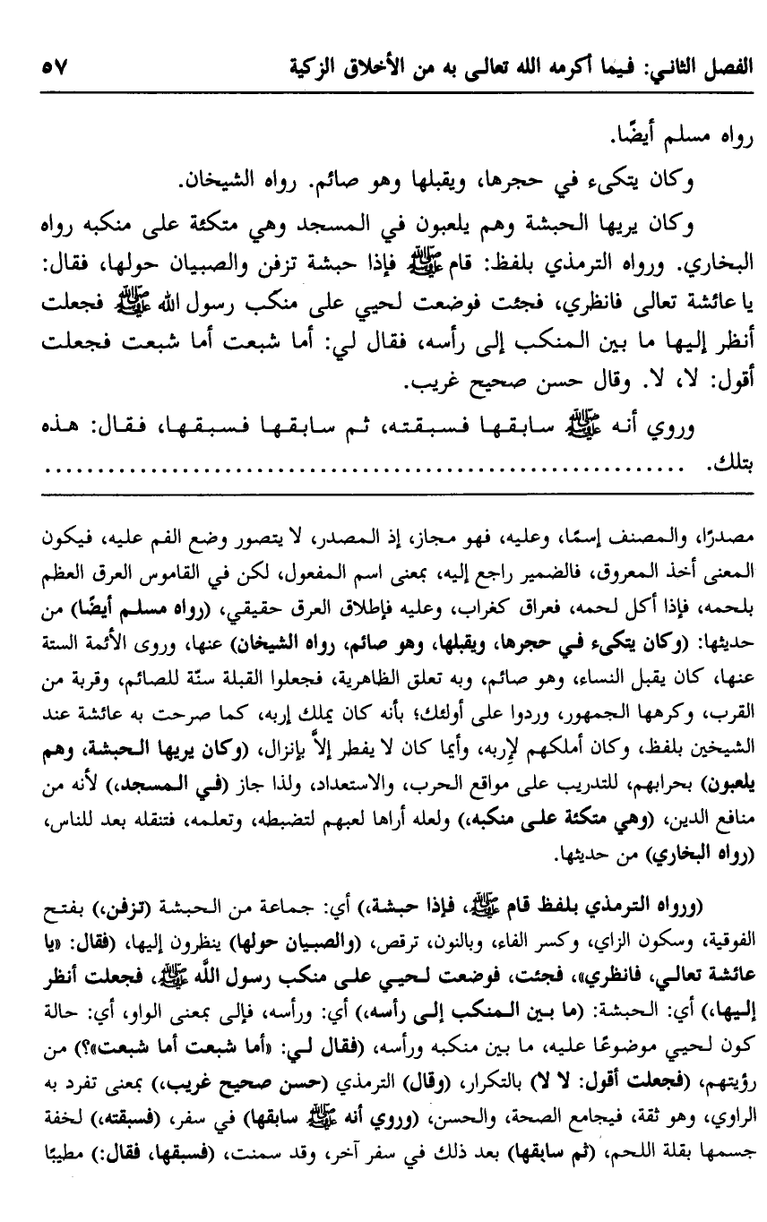 وكان يريها الحبشة وهم يلعبون في المسجد وهي متكئة على منكبة, رواه البخاري. ورواه الترمذي، بلفظ: قام -صلى الله عليه وسلم, فإذا حبشة تزفن والصبين حولها، فقال: يا عائشة تعالي فانظري، فجئت فوضعت لحيي على منكب رسول الله -صلى الله عليه وسلم, فجعلت أنظر إليها ما بين المنكب إلى رأسه، فقال لي: أما شبعت, فجعلت أقول: لا، لا. وقال: حسن صحيح غريب.