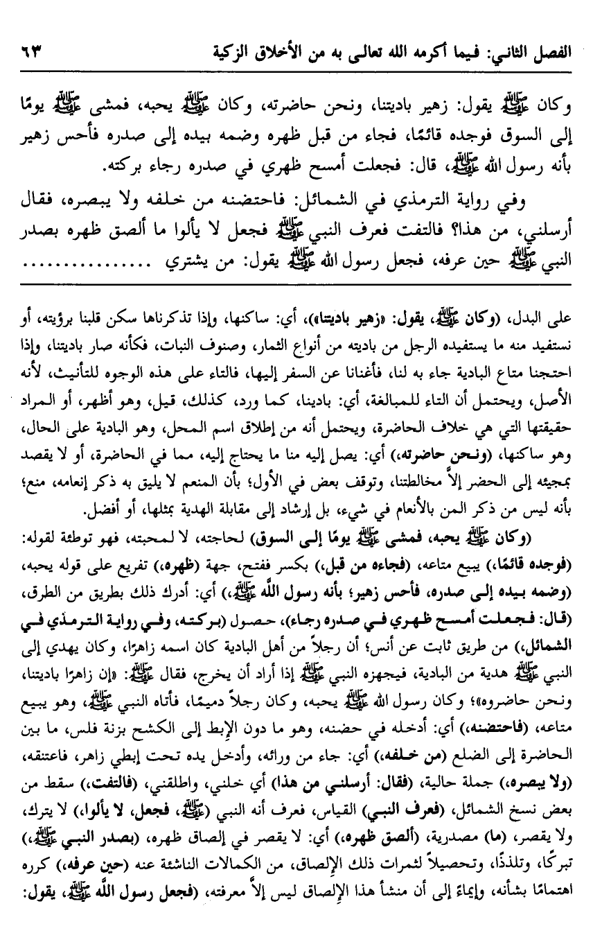 "وكان -صلى الله عليه وسلم- يحبه، فمشى -صلى الله عليه وسلم- يومًا إلى السوق" لحاجته، لا لمحبته، فهو توطئة لقوله: "فوجده قائمًا" يبيع متاعه، "فجاءه من قِبَل" بكسر ففتح، جهة "ظهره" تفريع على قوله يحبه، "وضمَّه بيده إلى صدره، فأحسَّ زهير بأنه رسول الله -صلى الله عليه وسلم" أي: أدرك ذلك بطريق من الطرق، "قال: فجعلت أمسح ظهري في صدره رجاء"، حصول "بركته، وفي رواية الترمذي في الشمائل" من طريق ثابت عن أنس؛ أن رجلًا من أهل البادية كان اسمه زاهرًا، وكان يهدي إلى النبي -صلى الله عليه وسلم- هدية من البادية، فيجهزه النبي -صلى الله عليه وسلم- إذا أراد أن يخرج، فقال -صلى الله عليه وسلم: "إن زاهرًا باديتنا، ونحن حاضروه"؛ وكان رسول الله -صلى الله عليه وسلم- يحبه، وكان رجلًا دميمًا، فأتاه النبي -صلى الله عليه وسلم، وهو يبيع متاعه، "فاحتضنه" أي: أدخله في حضنه، وهو ما دون الإبط إلى الكشح بزنة فِلس، ما بين الحاضرة إلى الضلع "من خلفه" أي: جاء من ورائه، وأدخل يده تحت إبطي زاهر، فاعتنقه، "ولا يبصره" جملة حالية، "فقال: أرسلني من هذا" أي: خلني، وأطلقني، "فالتفتّ" سقط من بعض نسخ الشمائل، "فعرف النبي" القياس، فعرف أنه النبي "صلى الله عليه وسلم، فجعل، لا يألوا" لا يترك، ولا يقصر، "ما" مصدرية، "ألصق ظهره" أي: لا يقصر في إلصاق ظهره، "بصدر النبي -صلى الله عليه وسلم" تبركًا، وتلذذًا، وتحصيلًا لثمرات ذلك الإلصاق، من الكمالات الناشئة عنه "حين عرفه" كرره اهتمامًا بشأنه، وإيماء إلى أن منشأ هذا الإلصاق ليس إلا معرفته، "فجعل رسول الله -صلى الله عليه وسلم- يقول: