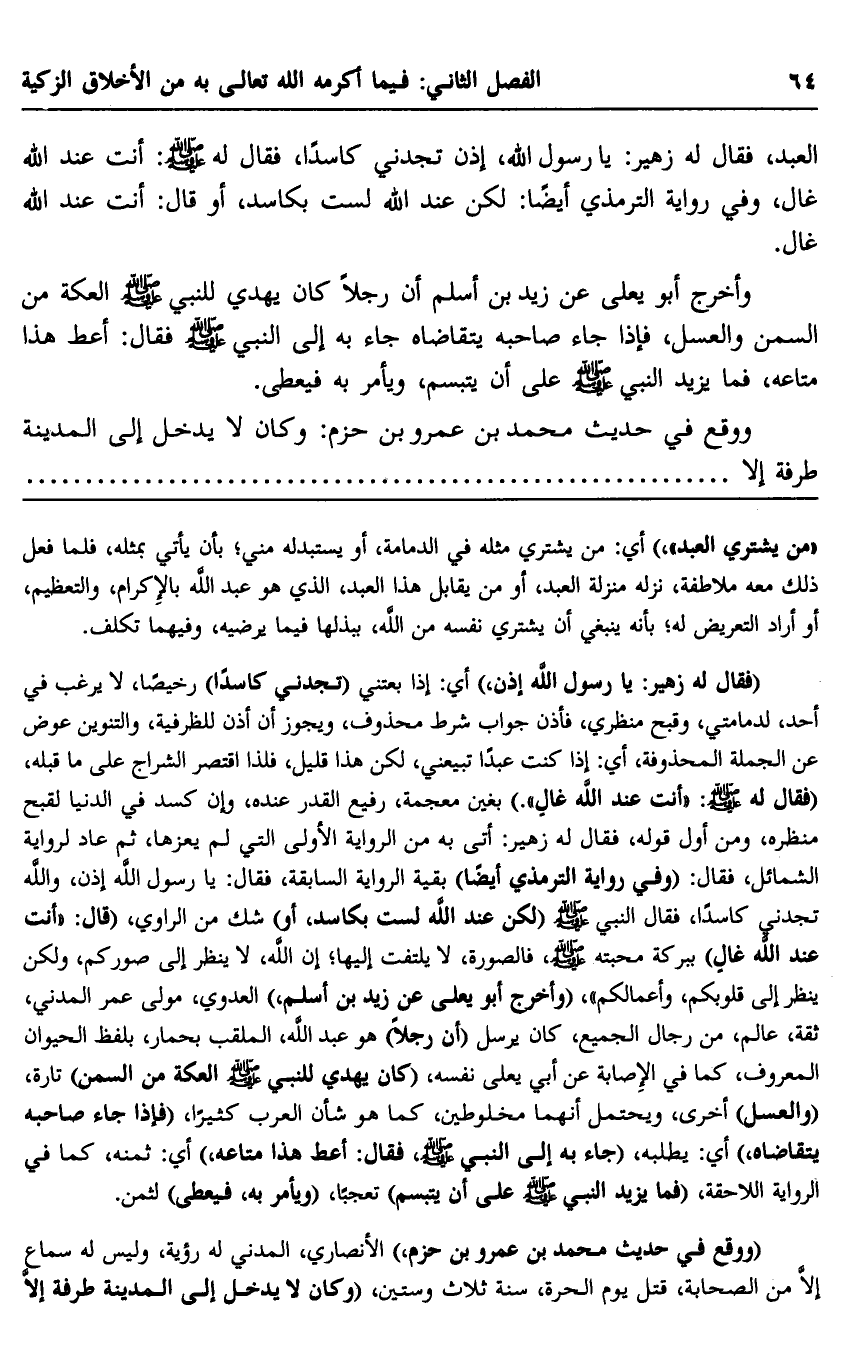 "فقال له زهير: يا رسول الله إذن" أي: إذا بعتني "تجدني كاسدًا" رخيصًا، لا يرغب فيَّ أحد لدمامتي، وقبح منظري، فأذن جواب شرط محذوف، ويجوز أن أذن للظرفية، والتنوين عوض عن الجملة المحذوفة، أي: إذا كنت عبدًا تبيعني، لكن هذا قليل، فلذا اقتصر الشراح على ما قبله، "فقال له -صلى الله عليه وسلم: "أنت عند الله غال" بغين معجمة، رفيع القدر عنده، وإن كسد في الدنيا لقبح منظره، ومن أول قوله، فقال له زهير: أتى به من الرواية الأولى التي لم يعزها، ثم عاد لرواية الشمائل، فقال: "وفي رواية الترمذي أيضًا" بقية الرواية السابقة، فقال: يا رسول الله إذن، والله تجدني كاسدًا، فقال النبي -صلى الله عليه وسلم: "لكن عند الله لست بكاسد، أو" شك من الراوي، "قال: "أنت عند الله غال" ببركة محبته -صلى الله عليه وسلم، فالصورة، لا يلتفت إليها؛ "إن الله لا ينظر إلى صوركم، ولكن ينظر إلى قلوبكم وأعمالكم" "وأخرج أبو يعلى عن زيد بن أسلم" العدوي، مولى عمر المدني، ثقة، عالم، من رجال الجميع، كان يرسل "أن رجلًا" هو عبد الله، الملقَّب بحمار، بلفظ الحيوان المعروف، كما في الإصابة عن أبي يعلى نفسه، "كان يهدي للنبي -صلى الله عليه وسلم- العكة من السمن" تارة، "والعسل" أخرى، ويحتمل أنهما مخلوطين، كما هو شأن العرب كثيرًا، "فإذا جاء صاحبه يتقاضاه" أي: يطلبه، "جاء به إلى النبي -صلى الله عليه وسلم- فقال: "أعط هذا متاعه" أي: ثمنه، كما في الرواية اللاحقة، "فما يزيد النبي -صلى الله عليه وسلم- على أن يتبسم" تعجبًا، "ويأمر به، فيعطى" لثمن.