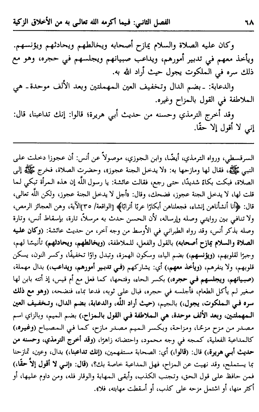 السرقسطي، ورواه الترمذي، أيضًا، وابن الجوزي، موصولًا عن أنس: إن عجوزًا دخلت على النبي -صلى الله عليه وسلم- فقال لها ومازحها به: "لا يدخل الجنة عجوز"، وحضرت الصلاة، فخرج -صلى الله عليه وسلم- إلى الصلاة، فبكت بكاء شديدًا، حتى رجع، فقالت عائشة: يا رسول الله إن هذه المرأة تبكي لما قلت لها، لا يدخل الجنة عجوز، فضحك، وقال: "أجل لا يدخل الجنة عجوز، ولكن الله تعالى قال: {إِنَّا أَنْشَأْنَاهُنَّ إِنْشَاءً، فَجَعَلْنَاهُنَّ أَبْكَارًا، عُرُبًا أَتْرَابًا} [الواقعة: 35] الآية "، وهن العجائز الرمص، ولا تنافي بين روايتي وصله وإرساله؛ لأن الحسن حدَّث به مرسلًا تارة بإسقاط أنس، وتارة وصله بذكر أنس، وقد رواه الطبراني في الأوسط من وجه آخر، من حديث عائشة: "وكان -عليه الصلاة والسلام- يمازح أصحابه" بالقول والفعل، للملاطفة، "ويخالطهم، ويحادثهم" تأنيسًا لهم، وجبرًا لقلوبهم، ولا ينفرهم، "ويأخذ معهم" أي: يشاركهم "في تدبير أمورهم، ويداعب" بدال مهملة، "صبيانهم، ويجلسهم في حجره" بكسر الحاء، وفتحها، كما فعل مع أم قيس؛ إذ أتته بابن لها صغير لم يأكل الطعام، فأجلسه في حجره، فبال على ثوبه، فدعا بماء، فنضحه، "وهو مع ذلك سره في الملكوت، يجول" بالجيم، "حيث أراد الله، والدعابة -بضم الدال، وتخفيف العين المهملتين، وبعد الألف موحدة: هي الملاطفة في القول بالمزاح -بضم الميم، وبالزاي: اسم مصدر من مزح مزحا، ومزاحة، وبكسر الميم مصدر مازح، كما في المصباح "وغيره" كالمداعبة الفعلية، كمجه في وجه محمود، واحتضانه زاهرًا، "وقد أخرج الترمذي، وحسنه من حديث أبي هريرة" قال: "قالوا:" أي: الصحابة مستفهمين، "إنك تداعبنا" -بدال وعين، تمازحنا بما يستملح، وقد نهيت عن المزاح، فهل المداعبة خاصة بك؟ "قال: "إني لا أقول إلا حقًّا" فمن حافظ على قول الحق، وتجنب الكذب، وأبقى المهابة والوقار فله، ومن داوم عليها، أو أكثر منها، أو اشتمل مزحه على كذب، أو أسقطت مهابته، فلا".