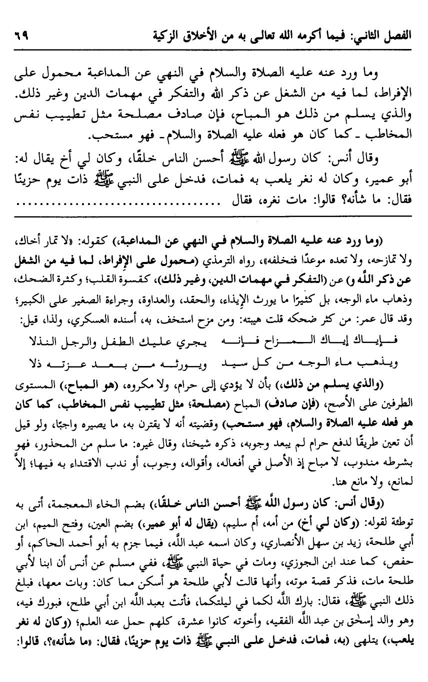 وقال أنس: كان رسول الله -صلى الله عليه وسلم- أحسن الناس خلقًا، وكان لي أخ يقال له: أبو عمير، وكان له نغر يلعب به فمات، فدخل على النبي -صلى الله عليه وسلم- ذات يوم حزينًا فقال: ما شأنه؟ قالوا: مات نغره، فقال......................................................