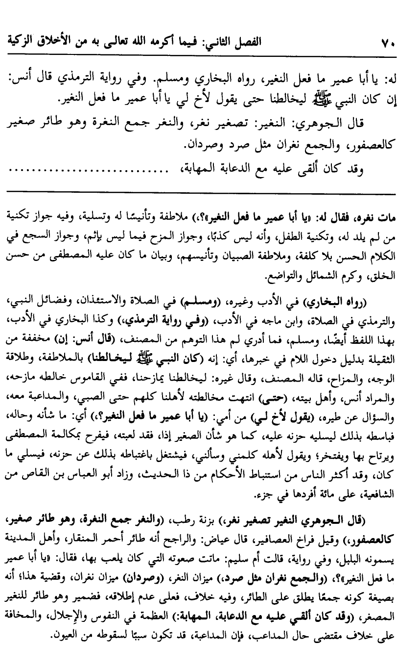 له: "يا أبا عمير ما فعل النغير"، رواه البخاري ومسلم. وفي رواية الترمذي قال أنس: إن كان النبي -صلى الله عليه وسلم- ليخالطنا حتى يقول لأخ لي: "يا أبا عمير ما فعل النغير".