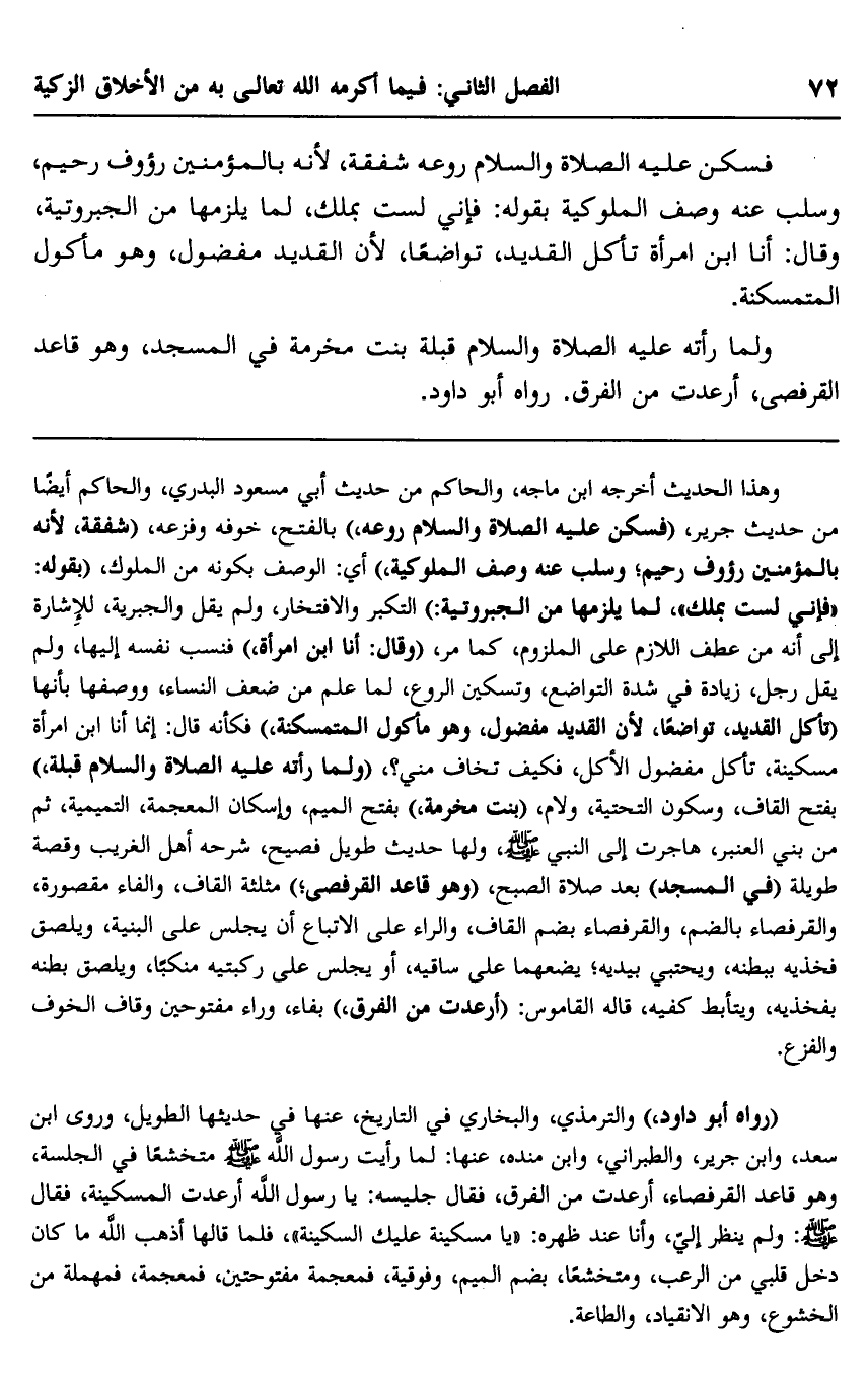"رواه أبو داود" والترمذي، والبخاري في التاريخ، عنها في حديثها الطويل، وروى ابن سعد، وابن جرير، والطبراني، وابن منده، عنها: لما رأيت رسول الله -صلى الله عليه وسلم- متخشعًا في الجلسة، وهو قاعد القرفصاء، أرعدت من الفرق، فقال جليسه: يا رسول الله أرعدت المسكينة، فقال -صلى الله عليه وسلم: ولم ينظر إليّ، وأنا عند ظهره: "يا مسكينة عليك السكينة" , فلما قالها أذهب الله ما كان دخل قلبي من الرعب، ومتخشعًا، بضم الميم، وفوقية، فمعجمة مفتوحتين، فمعجمة، فمهملة من الخشوع، وهو الانقياد، والطاعة.