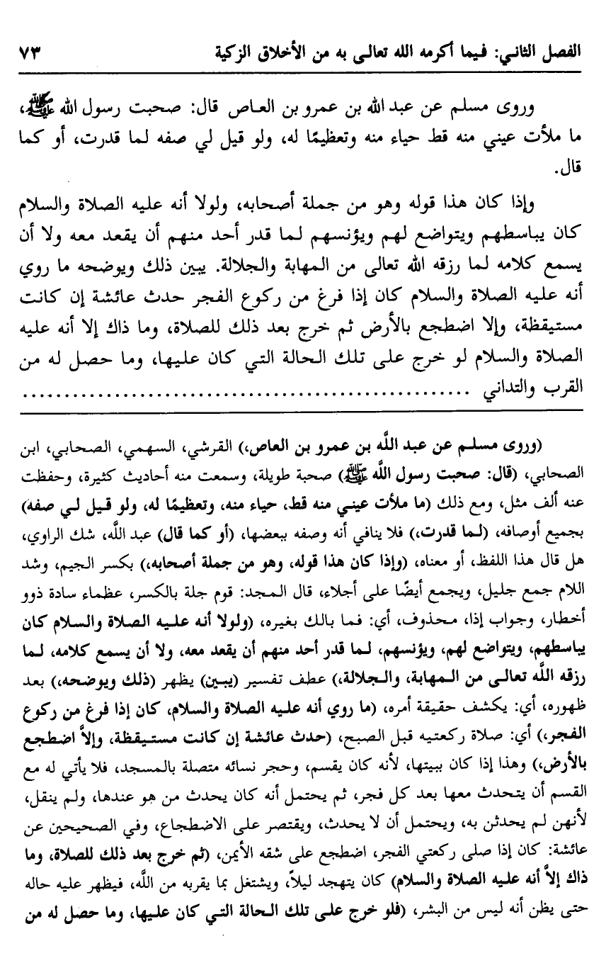 "وروى مسلم عن عبد الله بن عمرو بن العاص" القرشي، السهمي، الصحابي، ابن الصحابي، "قال: صحبت رسول الله -صلى الله عليه وسلم" صحبة طويلة، وسمعت منه أحاديث كثيرة، وحفظت عنه ألف مثل، ومع ذلك "ما ملأت عيني منه قط، حياء منه، وتعظيمًا له، ولو قيل لي صفه" بجميع أوصافه، "لما قدرت", فلا ينافي أنه وصفه ببعضها، "أو كما قال" عبد الله، شك الراوي، هل قال هذا اللفظ، أو معناه، "وإذا كان هذا قوله، وهو من جلة أصحابه" -بكسر الجيم، وشد اللام- جمع جليل، ويجمع أيضًا على أجلاء، قال المجد: قوم جلة بالكسر، عظماء سادة ذوو أخطار، وجواب إذا، محذوف، أي: فما بال بغيره، "ولولا أنه -عليه الصلاة والسلام- كان يباسطهم، ويتواضع لهم، ويؤنسهم، لما قدر أحد منهم أن يقعد معه، ولا أن يسمع كلامه، لما رزقه الله تعالى من المهابة، والجلالة" عطف تفسير "يبين" يظهر "ذلك ويوضحه" بعد ظهوره، أي: يكشف حقيقة أمره، "ما روي أنه -عليه الصلاة والسلام، كان إذا فرغ من ركوع الفجر" أي: صلاة ركعتيه قبل الصبح، "حدَّث عائشة إن كانت مسيقظة، وإلا اضطجع بالأرض", وهذا إذا كان ببيتها، لأنه كان يقسم، وحجر نسائه متصلة بالمسجد، فلا يأتي له مع القسم أن يتحدث معها بعد كل فجر، ثم يحتمل أنه كان يحدث من هو عندها، ولم ينقل، لأنهن لم يحدثن به، ويحتمل أن لا يحدث، ويقتصر على الاضطجاع، وفي الصحيحين عن عائشة: كان إذا صلى ركعتي الفجر، اضطجع على شقه الأيمن، "ثم خرج بعد ذلك للصلاة، وما ذاك إلّا أنه -عليه الصلاة والسلام- كان يتهجد ليلًا ويشتغل بما يقربه من الله، فيظهر عليه حاله حتى يظن أنه ليس من البشر، "فلو خرج على تلك الحالة التي كان عليها، وما حصل له من