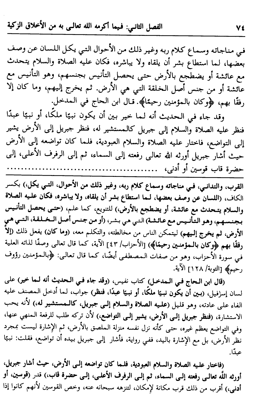 القرب، والتداني، في مناجاته وسماع كلام ربه، وغير ذلك من الأحوال، التي يكل" بكسر الكاف، "اللسان عن وصف بعضها، لما استطاع بشر أن يلقاه، ولا يباشره، فكان -عليه الصلاة والسلام- يتحدث مع عائشة، أو يضطجع بالأرض" للتنويع، كما علم، "حتى يحصل التأنيس بجنسهم، وهو التأنيس مع عائشة" التي هي بشر، "أو من جنس أصل الخلقة، التي هي الأرض، ثم يخرج إليهم" ليتمكن الناس من مخالطته، والتكلُّم معه، "وما كان" يفعل ذلك "إلا رفقًا بهم {وَكَانَ بِالْمُؤْمِنِينَ رَحِيمًا} [الأحزاب: 43] الآية. كما قال تعالى وصفًا لذاته العليا في سورة الأحاب، وهو من صفات المصطفى أيضًا، كما قال تعالى: {بِالْمُؤْمِنِينَ رَءُوفٌ رَحِيمٌ} [التوبة: 128] الآية.