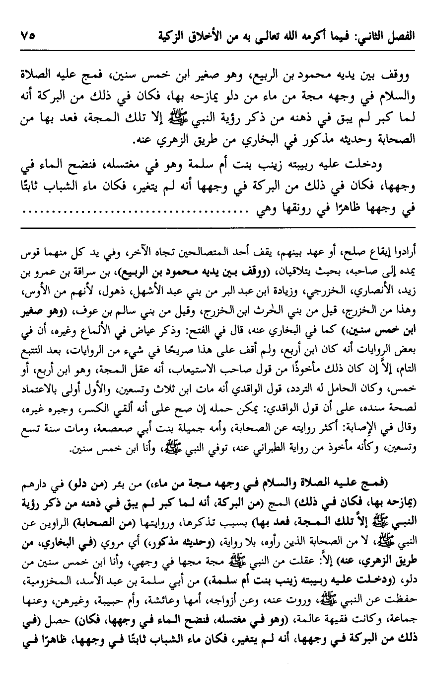 "فمجَّ -عليه الصلاة والسلام- في وجهه مجة من ماء" من بئر "من دلو" في رداهم "يمازحه بها، فكان في ذلك" المجّ "من البركة، أنه لما كبر لم يبق في ذهنه من ذكر رؤية النبي -صلى الله عليه وسلم- إلّا تلك المجة، فعدّ بها" بسبب تذكرها، وروايتها "من الصحابة" الراوين عن النبي -صلى الله عليه وسلم، لا من الصحابة الذين رأوه، بلا رواية، "وحديثه مذكور" أي: مروي "في البخاري، من طريق الزهري، عنه" إلّا: عقلت من النبي -صلى الله عليه وسلم مجة مجها في وجهي، وأنا ابن خمس سنين من دلو، "ودخلت عليه ربيبته زينب بنت أم سلمة" من أبي سلمة بن عبد الأسد، المخزومية، حفظت عن النبي -صلى الله عليه وسلم، وروت عنه، وعن أزواجه، أمها وعائشة، وأم حبيبة، وغيرهن، وعنها جماعة، وكانت فقيهة عالمة، "وهو في مغتسلة، فنضح الماء في وجهها، فكان" حصل "في ذلك من البركة في وجهها، أنه لم يتغيّر، فكان ماء الشباب ثابتًا في وجهها، ظاهرًا في