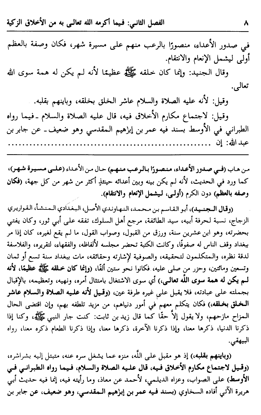 "وقال الجنيد"، أبو القاسم بن محمد, النهاوندي الأصل، البغدادي المنشأ، القواريري الزجاج، نسبة لحرفة أبيه، سيد الطائفة، مرجع أهل السلوك، تفقه على أبي ثور، وكان يفتي بحضرته وهو ابن عشرين سنة، ورزق من القبول وصواب القول ما لم يقع لغيره، كان إذا مرَّ ببغدد وقف الناس له صفوفًا، وكانت الكتبة تحضر مجلسه لألفاظه، والفقهاء لتقريره، والفلاسفة لدقة نظره، والمتكلمون لتحقيقه، والصوفية لإشارته وحقائقه، مات ببغداد سنة تسع أو ثمان وتسعين ومائتين، وحزر من صلى عليه، فكانوا نحو ستين ألفًا. "وإنما كان خلقه -صلى الله عليه وسلم- عظيمًا؛ لأنه لم يكن له همة سوى الله تعالى" أي: سوى الاشتغال بامتثال أمره ونهيه، وتعظيمه, بالإقبال بجملته على عبادته، فلا يقبل على غيره طرفة عين. "وقيل: لأنه -عليه الصلاة والسلام- عاشر الخَلْقَ بخُلُقه" فكان يتكلم معهم في أمور دنياهم، من مزيد تلطفه بهم، وإن اقتضى الحال المزاح مازحهم، ولا يقول إلّا حقًّا كما قال زيد بن ثابت: كنت جار النبي -صلى الله عليه وسلم، وكنا إذ ذكرنا الدنيا ذكرها معنا، وإذا ذكرنا الآخرة ذكرها معنا، وإذا ذكرنا الطعام ذكره معنا. رواه البيهقي.