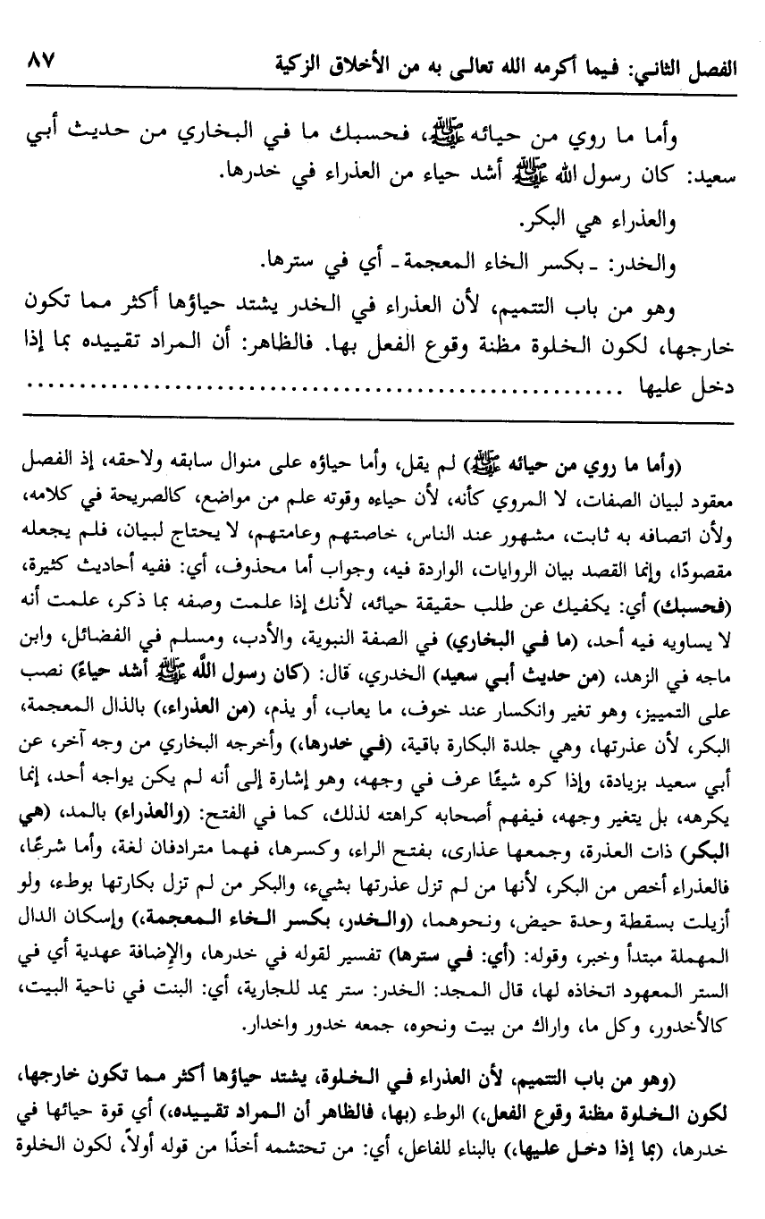 "وأما ما روي من حيائه -صلى الله عليه وسلم" لم يقل: وأما حياؤه على منوال سابقه ولاحقه؛ إذ الفصل معقود لبيان الصفات، لا المروي كأنه، لأن حياءه وقوته علم من مواضع، كالصريحة في كلامه، ولأن اتصافه به ثابت مشهور عند الناس، خاصتهم وعامتهم، لا يحتاج لبيان، فلم يجعله مقصودًا، وإنما القصد بيان الروايات الواردة فيه، وجواب أمَّا محذوف، أي: ففيه أحاديث كثيرة، "فحسبك" أي: يكفيك عن طلب حقيقة حيائه،؛لأنك إذا علمت وصفه بما ذكر، علمت أنه لا يساويه فيه أحد، "ما في البخاري" في الصفة النبوية، والأدب، ومسلم في الفضائل، وابن ماجه في الزهد، "من حديث أبي سعيد" الخدري، قال: "كان رسول الله -صلى الله عليه وسلم- أشد حياء" نصب على التمييز، وهو تغير وانكسار عند خوف ما يعاب أو يذم، "من العذراء" بالذال المعجمة، البكر، لأنَّ عذرتها وهي جلدة البكارة باقية، "في خدرها" وأخرجه البخاري من وجه آخر، عن أبي سعيد بزيادة: وإذا كره شيئًا عُرِفَ في وجهه، وهو إشارة إلى أنَّه لم يكن يواجه أحد إنما يكرهه بل يتغير وجهه، فيفهم أصحابه كراهته لذلك، كما في الفتح: "والعذراء" بالمد، "هي البكر" ذات العذرة، وجمعها عذارى، بفتح الراء، وكسرها، فهما مترادفان لغة، وأما شرعًا: فالعذراء أخص من البكر، لأنها من لم تزل عذرتها بشيء، والبكر من لم تزل بكارتها بوطء، ولو أزيلت بسقطة وحدة حيض، ونحوهما، "والخدر، بكسر الخاء المعجمة وإسكان الدال المهملة مبتدأ وخبر، وقوله: "أي: في سترها" تفسير لقوله في خدرها، والإضافة عهدية, أي: في الستر المعهود اتخاذه لها، قال المجد: الخدر: ستر يمد للجارية، أي: البنت في ناحية البيت، كالأخدور، وكل ما واراك من بيت ونحوه، جمعه خدور وأخدار.