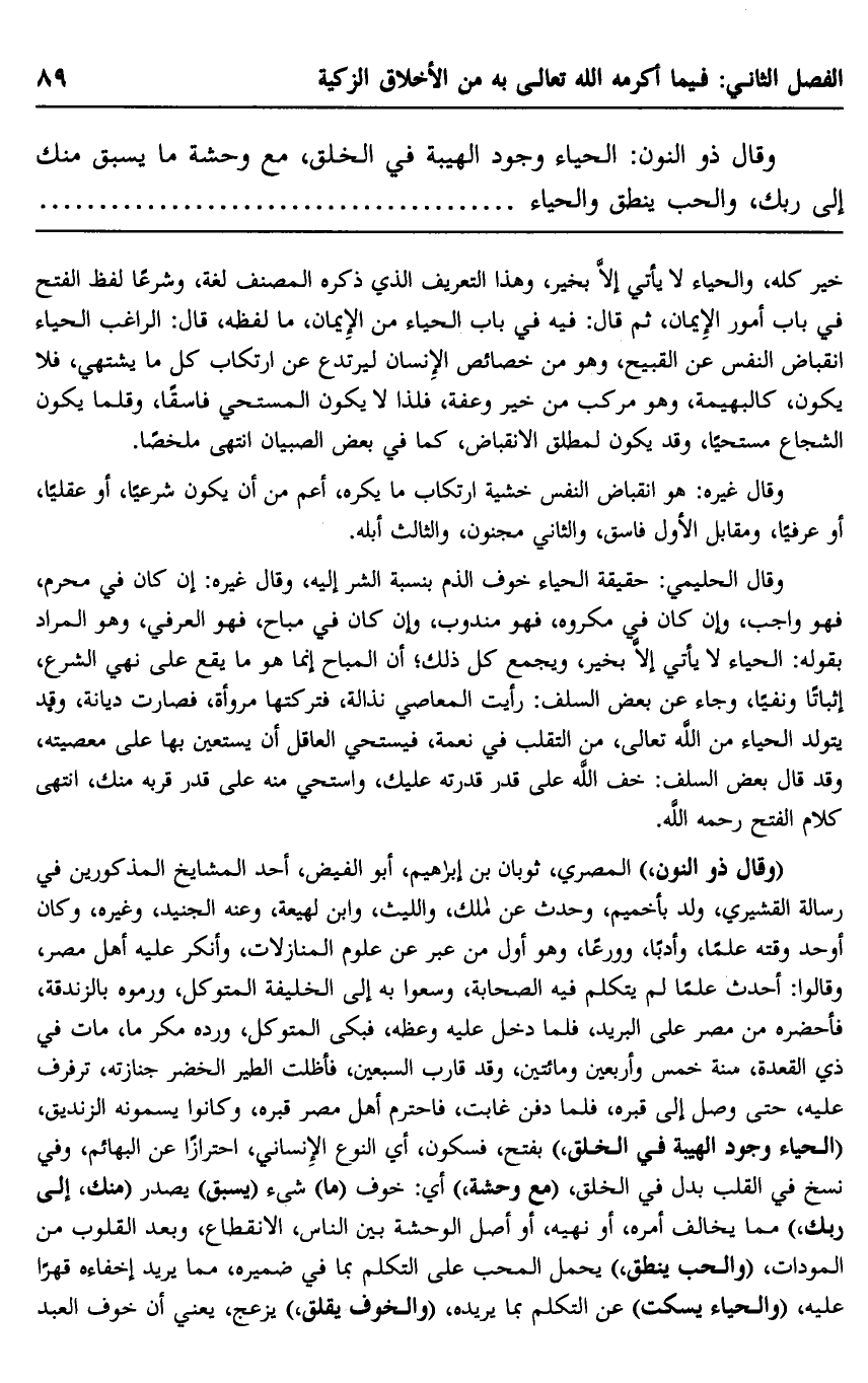 "وقال ذو النون" المصري، ثوبان بن إبراهيم، أبو الفيض، أحد المشايخ المذكورين في رسالة القشيري، ولد بأخميم، وحدَّث عن مالك، والليث، وابن لهيعة، وعنه الجنيد، وغيره، وكان أوحد وقته علمًا، وأدبًا، وورعًا، وهو أول من عَبَّر عن علوم المنازلات، وأنكر عليه أهل مصر، وقالوا: أحدث علمًا لم يتكلّم فيه الصحابة، وسعوا به إلى الخليفة المتوكّل، ورده مكر ما، مات في ذي القعدة سنة خمس وأربعين ومائتين، وقد قارب السبعين، فأظلت الطير الخضر جنازته ترفرف عليه حتى وصل إلى قبره، فلمَّا دفن غابت، فاحترم أهل مصر قبره، وكانوا يسمونه الزنديق، "الحياء وجود الهيبة في الخلق" بفتح، فسكون، أي: النوع الإنساني، احترازًا عن البهائم، وفي نسخ في القلب بدل في الخلق، "مع وحشة" أي: خوف "ما" شيء "يسبق" يصدر "منك، إلى ربك" مما يخالف أمره، أو نهيه، أو أصل الوحشة بين الناس، الانقطاع، وبعد القلوب من المودات، "والحب ينطق" يحمل المحب على التكلم بما في ضميره، مما يريد إخفاءه قهرًا عليه، "والحياء يُسْكِتُ" عن التكلم بما يريده، إخفاءه قهرًا عليه، "والحياء يسكت" عن التكلّم بما يريده، "والخوف يقلق" يزعج، يعني أن خوف العبد