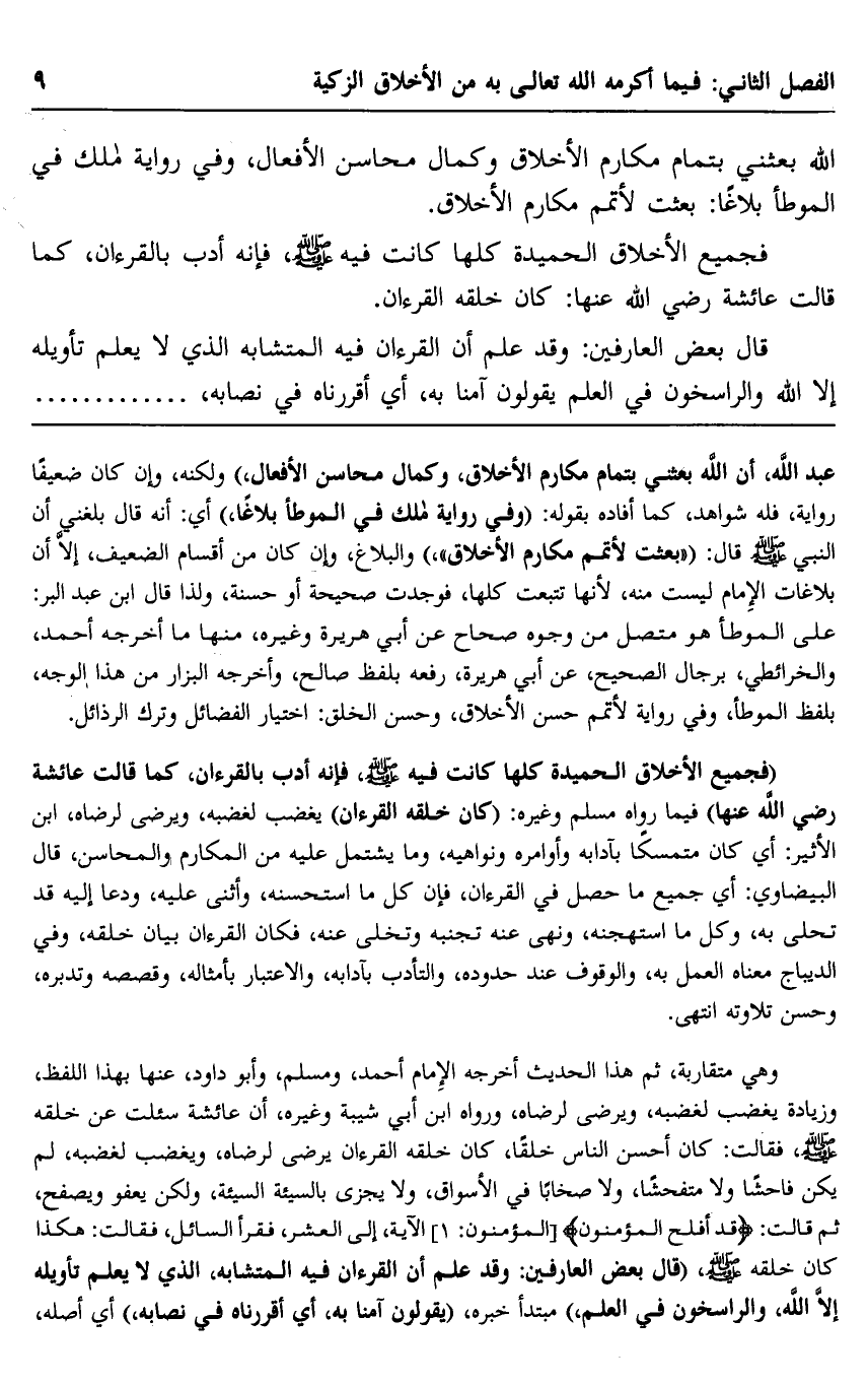 "فجميع الأخلاق الحميدة كلها كانت فيه -صلى الله عليه وسلم، فإنه أُدِّب بالقرآن، كما قالت عائشة -رضي الله عنها- فيما رواه مسلم وغيره: "كان خلقه القرآن" يغضب لغضبه، ويرضى لرضاه، ابن الأثير: أي كان متمسكا بآدابه وأوامره ونواهيه، وما يشتمل عليه من المكارم والمحاسن. وقال البيضاوي: أي جميع ما حصل في القرآن، فإن كل ما استحصنه، وأثنى عليه، ودعا إليه قد تحلَّى به، وكل ما استهجنه، ونهى عنه, تجنبه وتخلَّى عنه، فكان القرآن بيان خلقه، وفي الديباج معناه العمل به، والوقوف عند حدوده، والتأدُّب بآدابه، والاعتبار بأمثاله وقصصه, وتدبره وحسن تلاوته. انتهى.