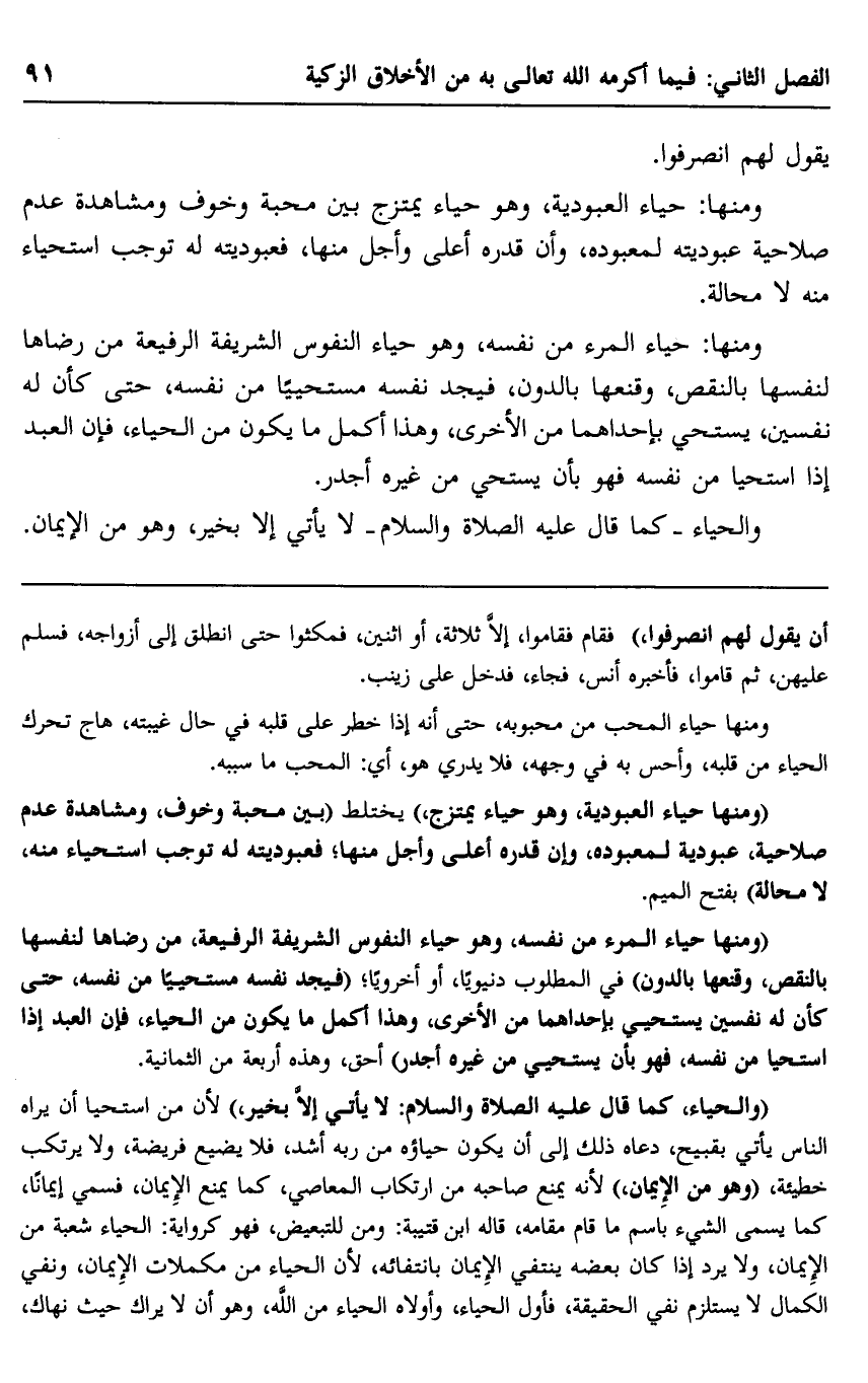 ومنها: حياء العبودية، وهو حياء يمتزج بين محبة وخوف ومشاهدة عدم صلاحية عبوديته لمعبوده، وأن قدره أعلى وأجلّ منها، فعبوديته له توجب استحياء منه لا محالة.